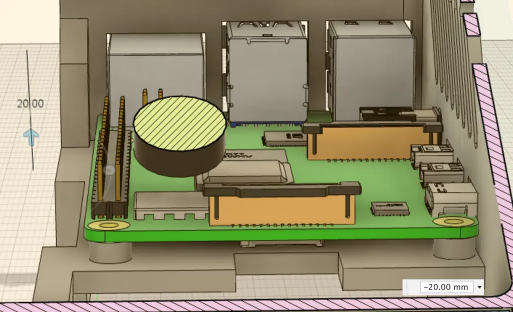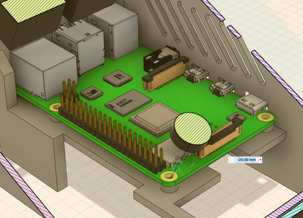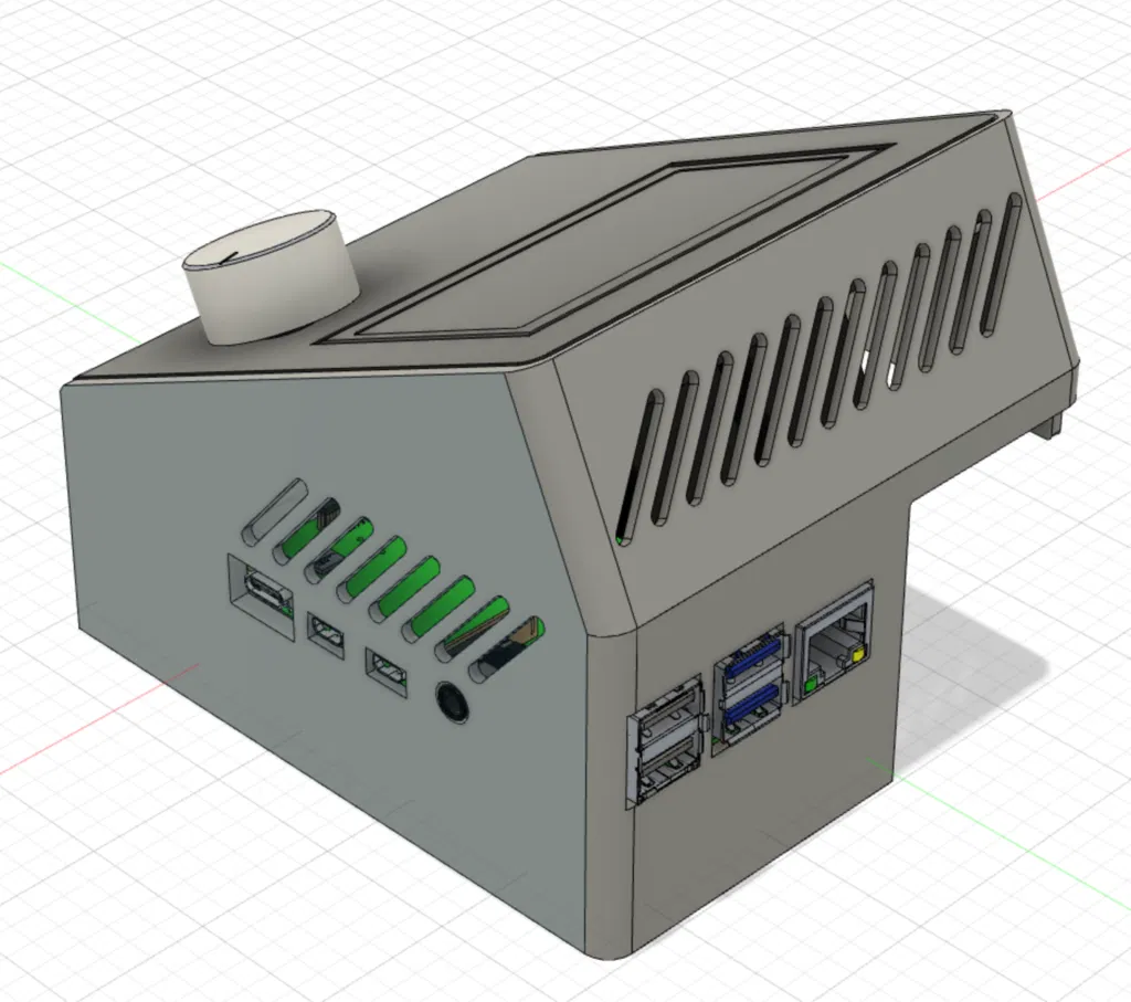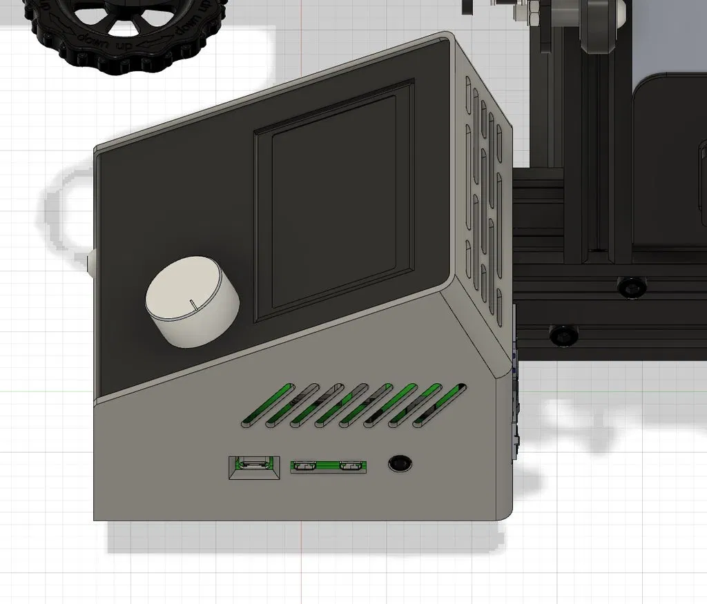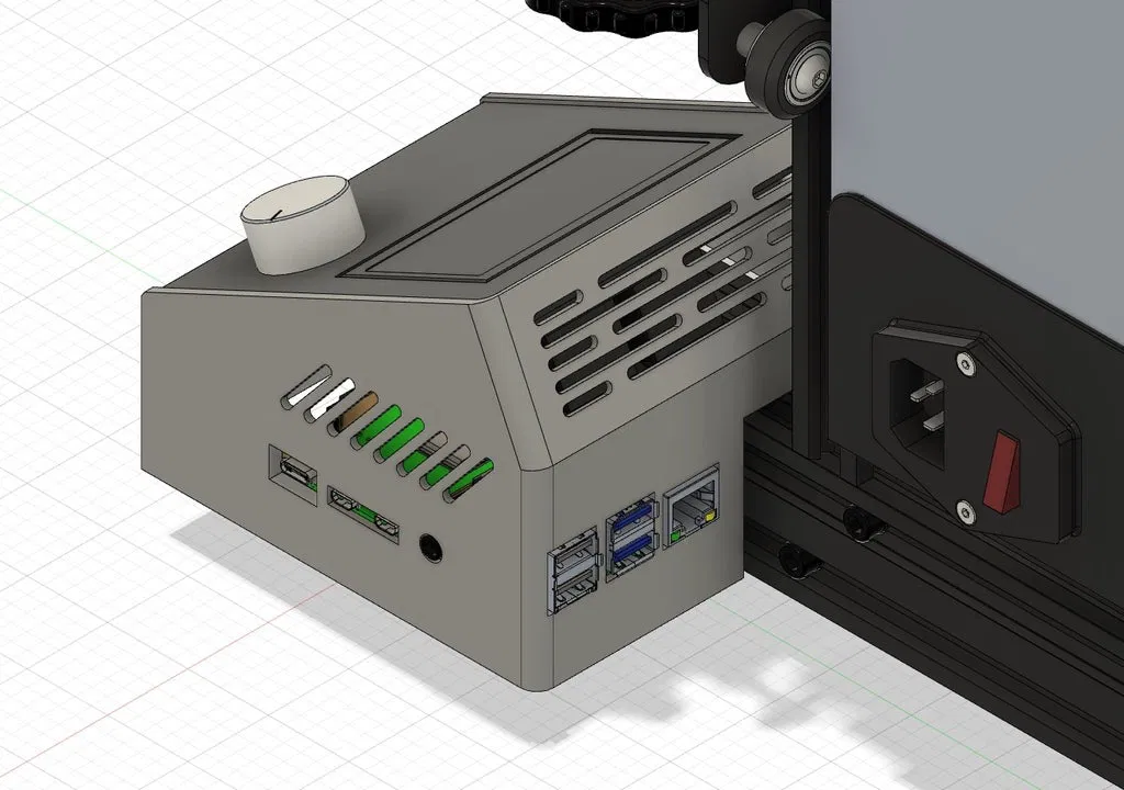 Mở phía sau bên trái một khe hở 10mm bên trên extrusion để đi dây. Lưu ý Raspberry Pi đã được nâng lên 8mm, tạo khoảng trống bên dưới cao 21mm để gắn buck converter, relay và các module khác. Việc này làm Raspberry Pi gần với LCD PCB hơn, dù vậy theo phân tích của mình trong Fusion 360 thì nó không che buzzer hay các cổng GPIO.