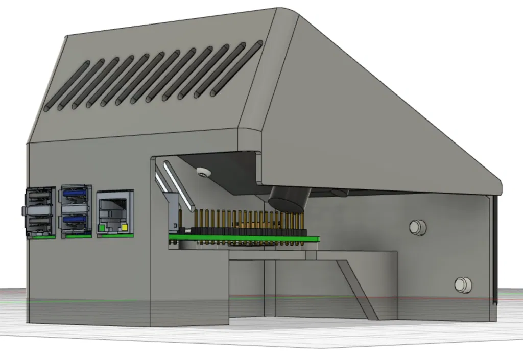 Bản remix nhanh từ case của HenryCAD: đã vừa Raspberry Pi 4, chỉnh vents để in dễ không cần support, khoét bên trái cho drawers và chừa khe 10mm đi dây. Pi nâng 8mm, có khoảng 21mm bên dưới để gắn module.