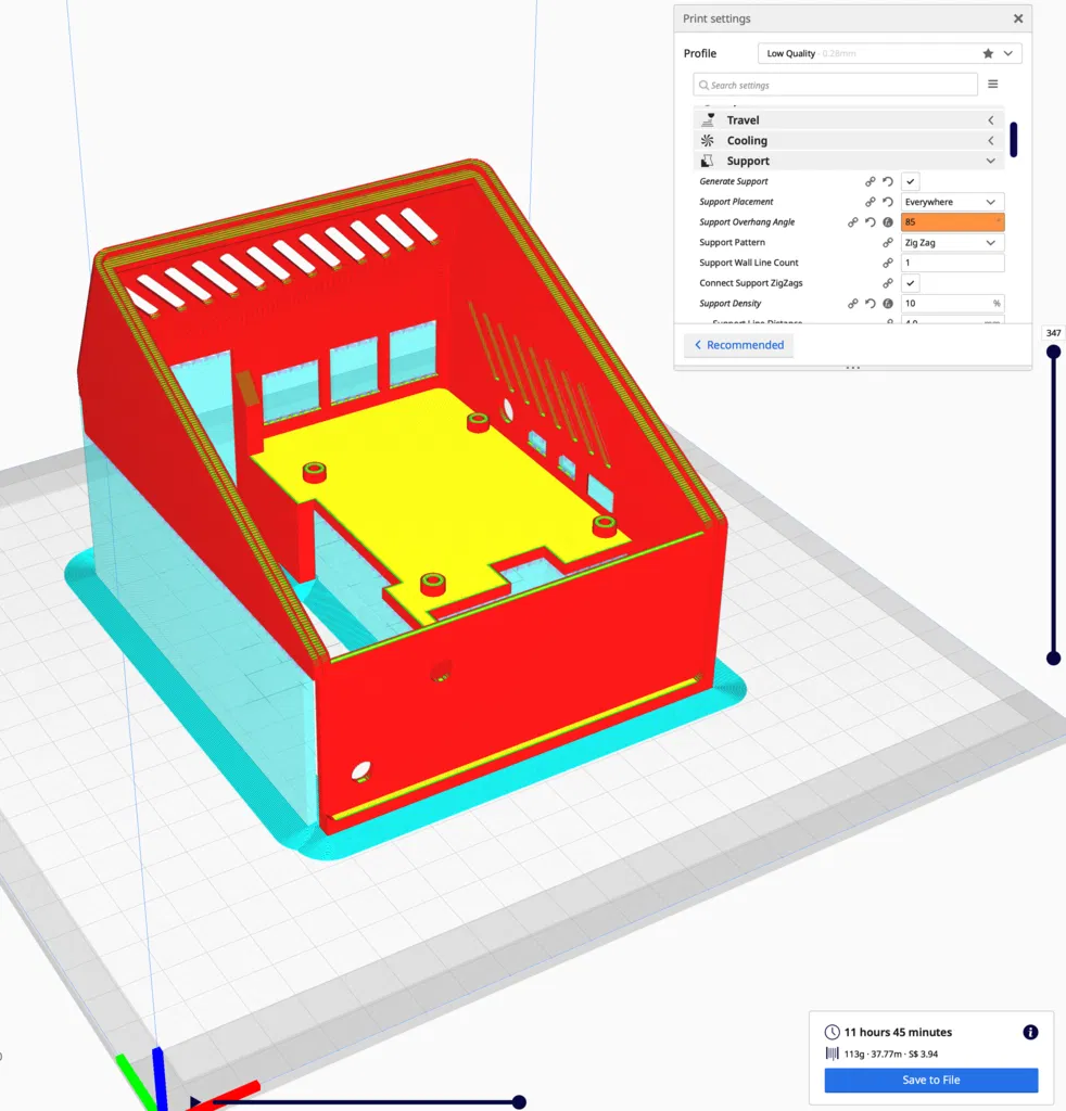 Xem ảnh chụp màn hình để biết slicer settings. Mình đã in mẫu này với brim để tăng bám dính. Supports đặt “everywhere” ở 85°; phần vents không cần support và cách này sẽ giúp tất cả các cổng (ports) được support.