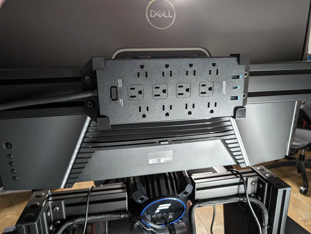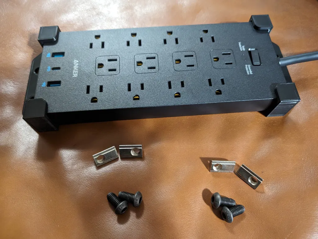 Ngàm (mount) in 3D để gắn ổ cắm chống sét Anker 351 lên profile nhôm định hình Sim Lab 80x40, lắp phía sau Freestanding Triple Vario Monitor Mount. Cần 4 bulông M8 và 4 M8 T-Nuts; in 2 ngàm.