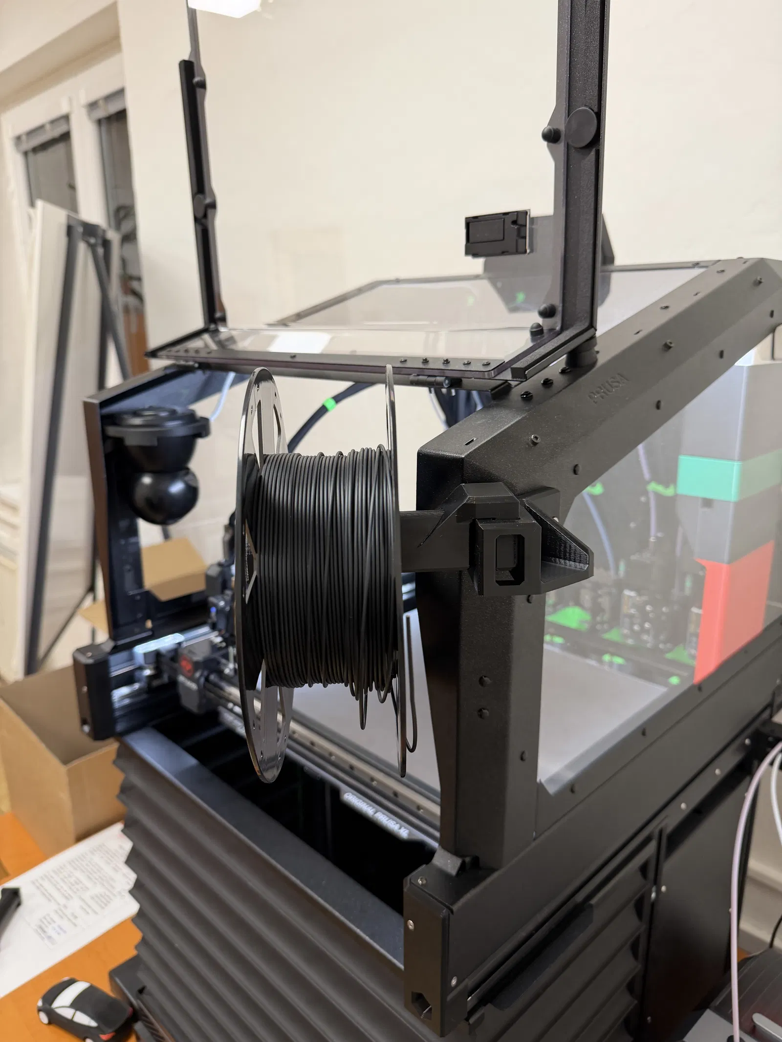 Bắt nó ở bên phải. Nếu bạn mirror model thì có thể gắn bên trái luôn. Phần spool holder thì chỉ cần trượt vào mount là xong, in xong thì rút ra để tránh bị cấn cửa (door collision).