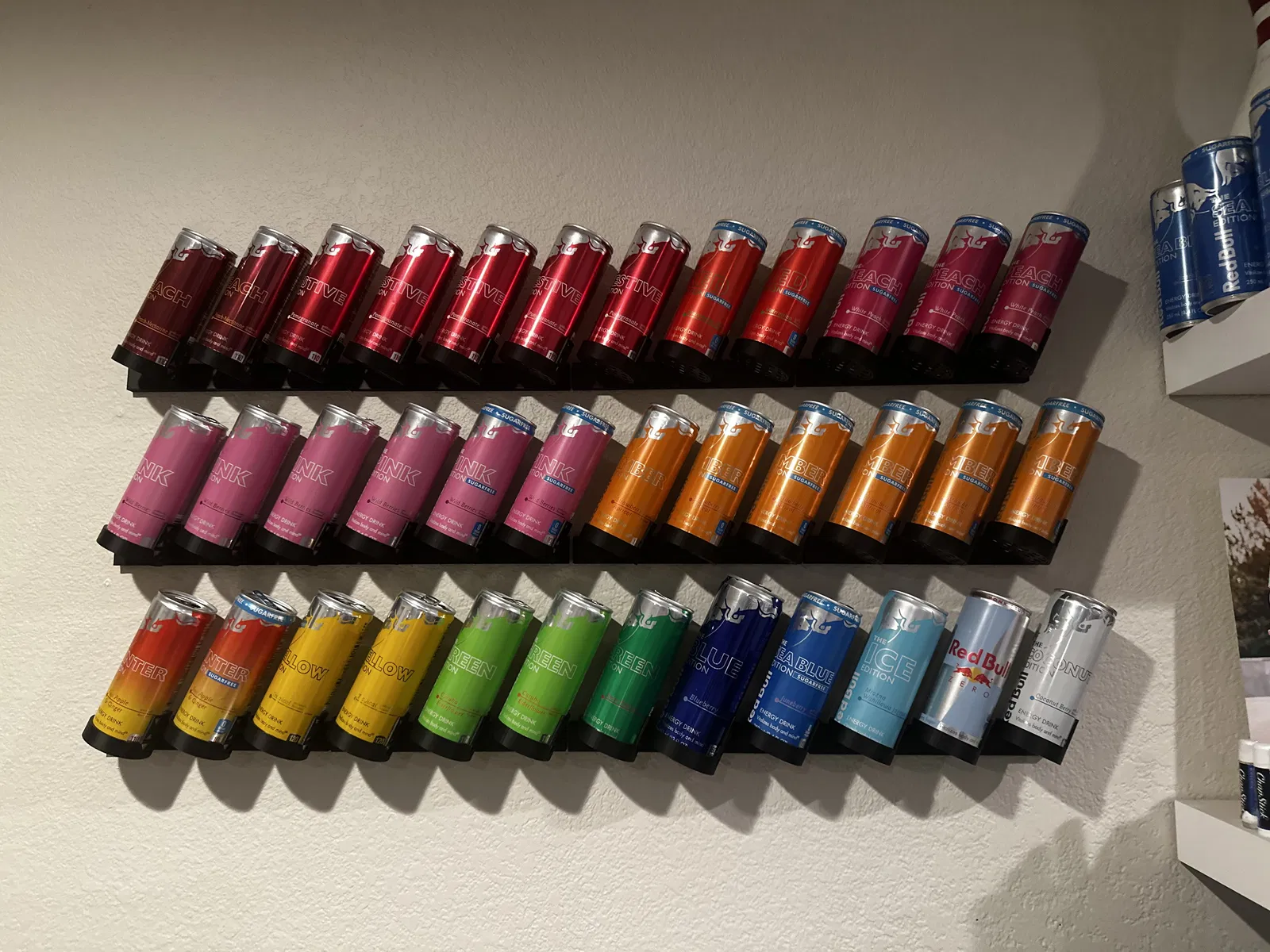 *Hình 1 là bức tường của mình hiện tại - Hình 2 có kèm 1 lon 12oz (hàng dưới cùng màu xanh) cùng với các lon 8.4oz của mình (để bạn thấy lên tường sẽ trông thế nào) - Hình 3 là góc nhìn từ trên xuống (bird's eye view) của mảng tường hiện tại - Hình 4 là bộ mình dùng cho 1 hàng gồm 4 base ghép lại, và 12 lon ở hàng đó (các block đã được dán cố định sẵn)*