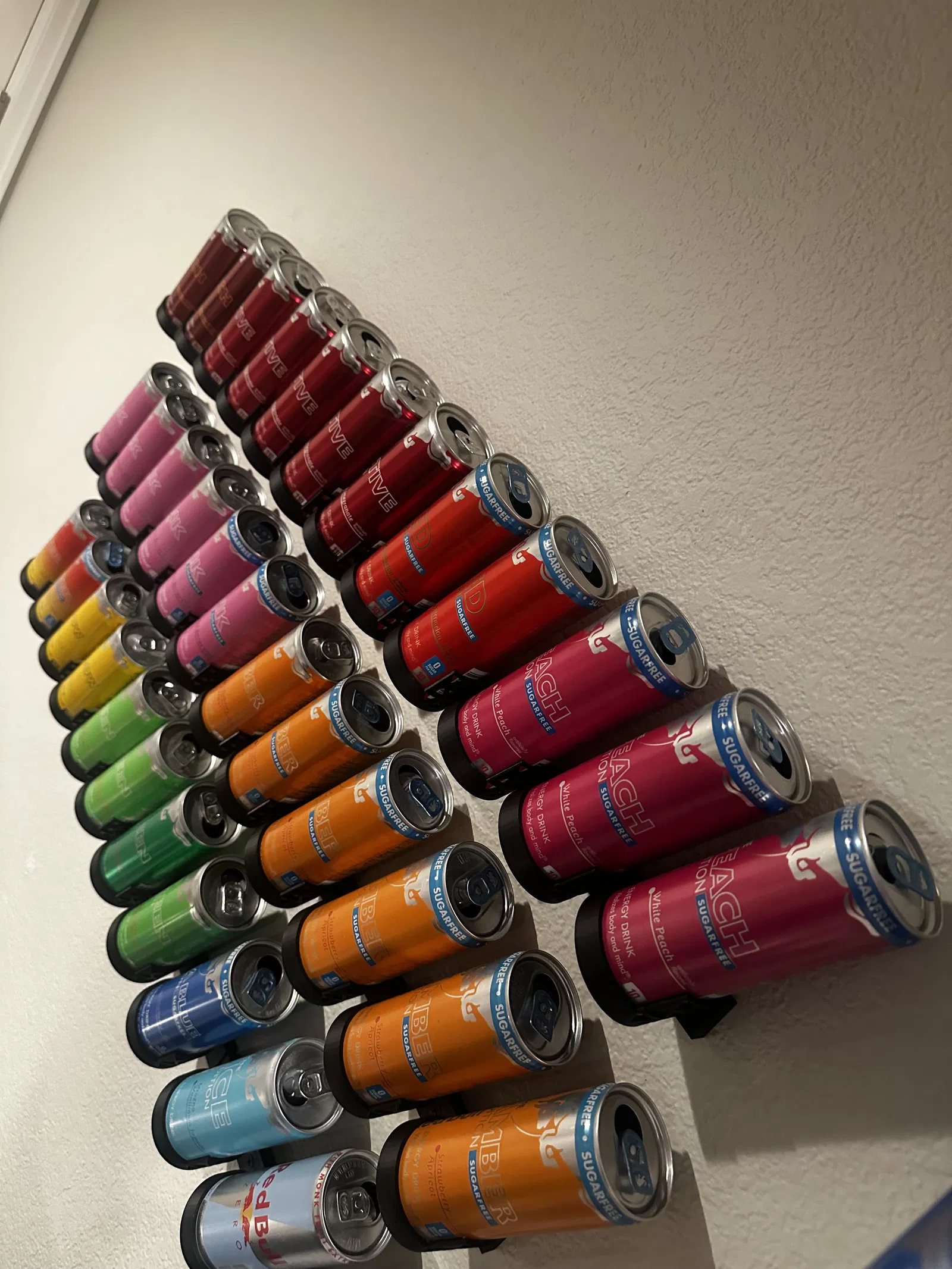 Kệ treo tường trưng bày lon Redbull cho cả 8.4oz/250mL và 12oz/355mL, dùng được lon đầy lẫn lon rỗng. Thiết kế press fit, mỗi lon cần CanSlip + BlockClip; WallBase giữ 3 lon và có thể mix size.