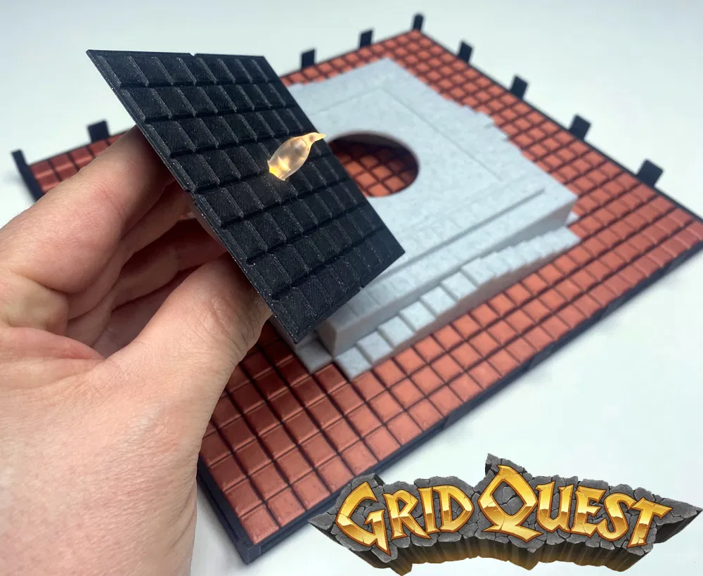 Cult Place dạng modular cho GridQuest (15x15 ô), có tuỳ chọn thả LED tealight tạo hiệu ứng ánh sáng. Gồm 5 phần: thân chính, nắp, mặt tile 8x8 có lỗ, flame và cầu thang. Có gợi ý decor Stonehenge để dungeon nổi bật hơn.