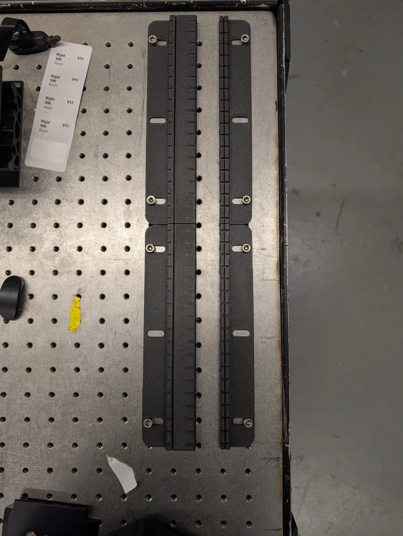 Bắt hai khối lên optical table hoặc bề mặt cứng tương tự có chuẩn lỗ cách nhau 1 inch, dùng ốc 1/4-20 hoặc M6. Chỉnh khoảng cách giữa khối dán băng (lớn) và khối canh kích thước (nhỏ) để ra chiều dài tuft mong muốn.