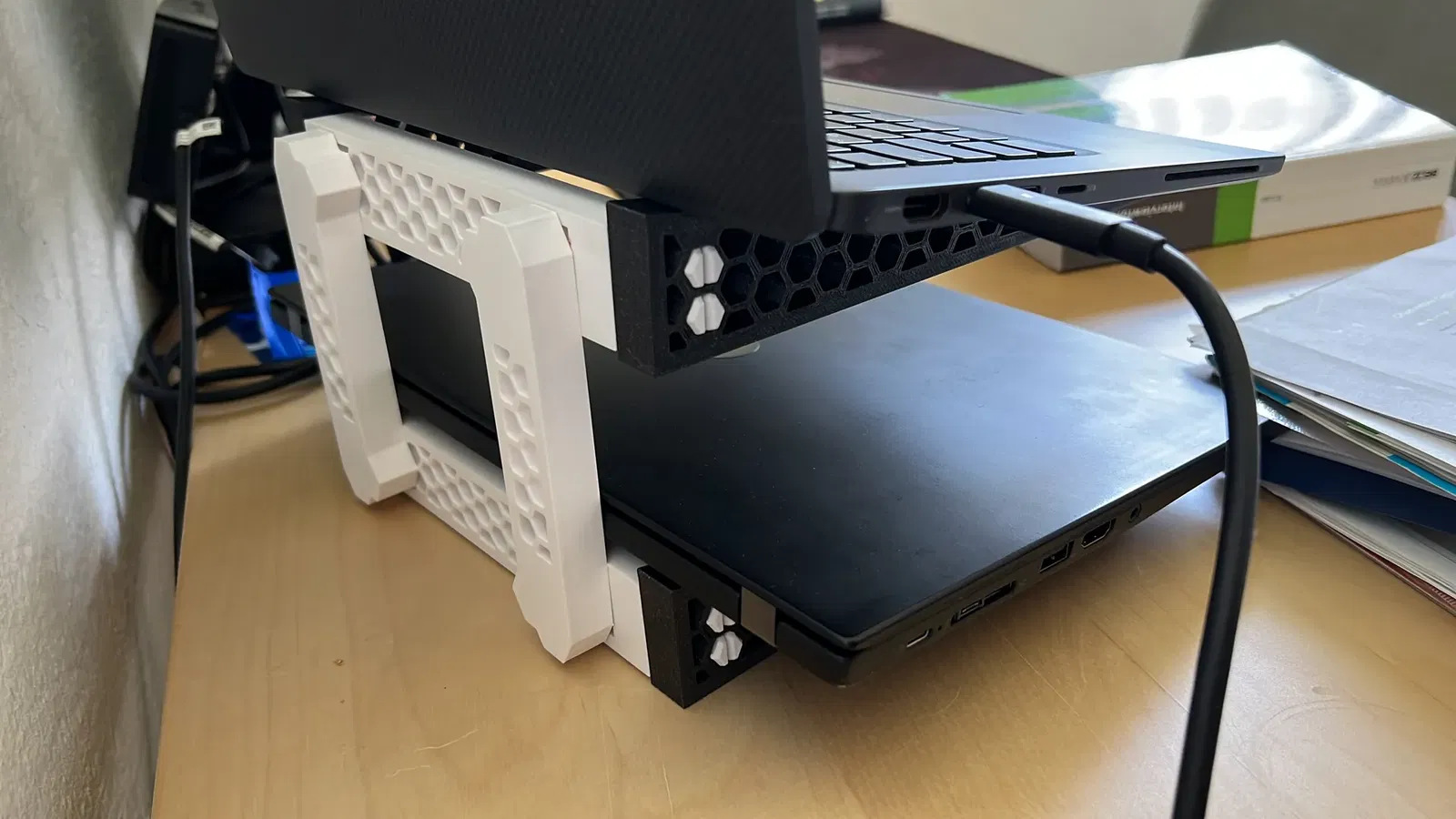 - Adapter kiểu staple để ghép 2 hoặc nhiều laptop (xem file STL)
