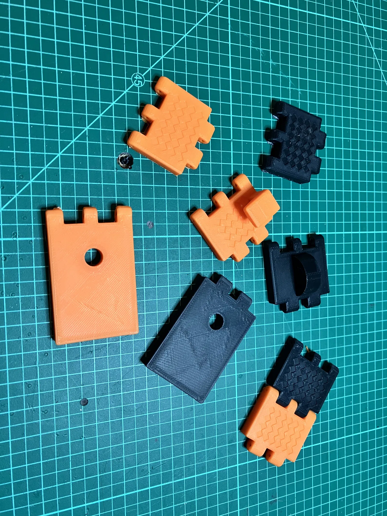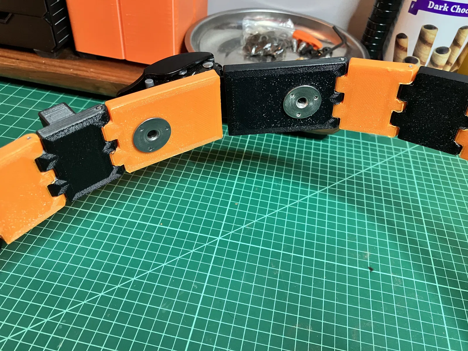 --Lưu ý co rút. Trên máy mình, link màu cam ra chặt hơn khá nhiều so với màu đen nên mình phải “năn nỉ” nó mới vào lỗ được. Nên in thử vài link trước và thử luồn chốt qua. Đừng có khoan/ream lại bằng mũi drill :) --