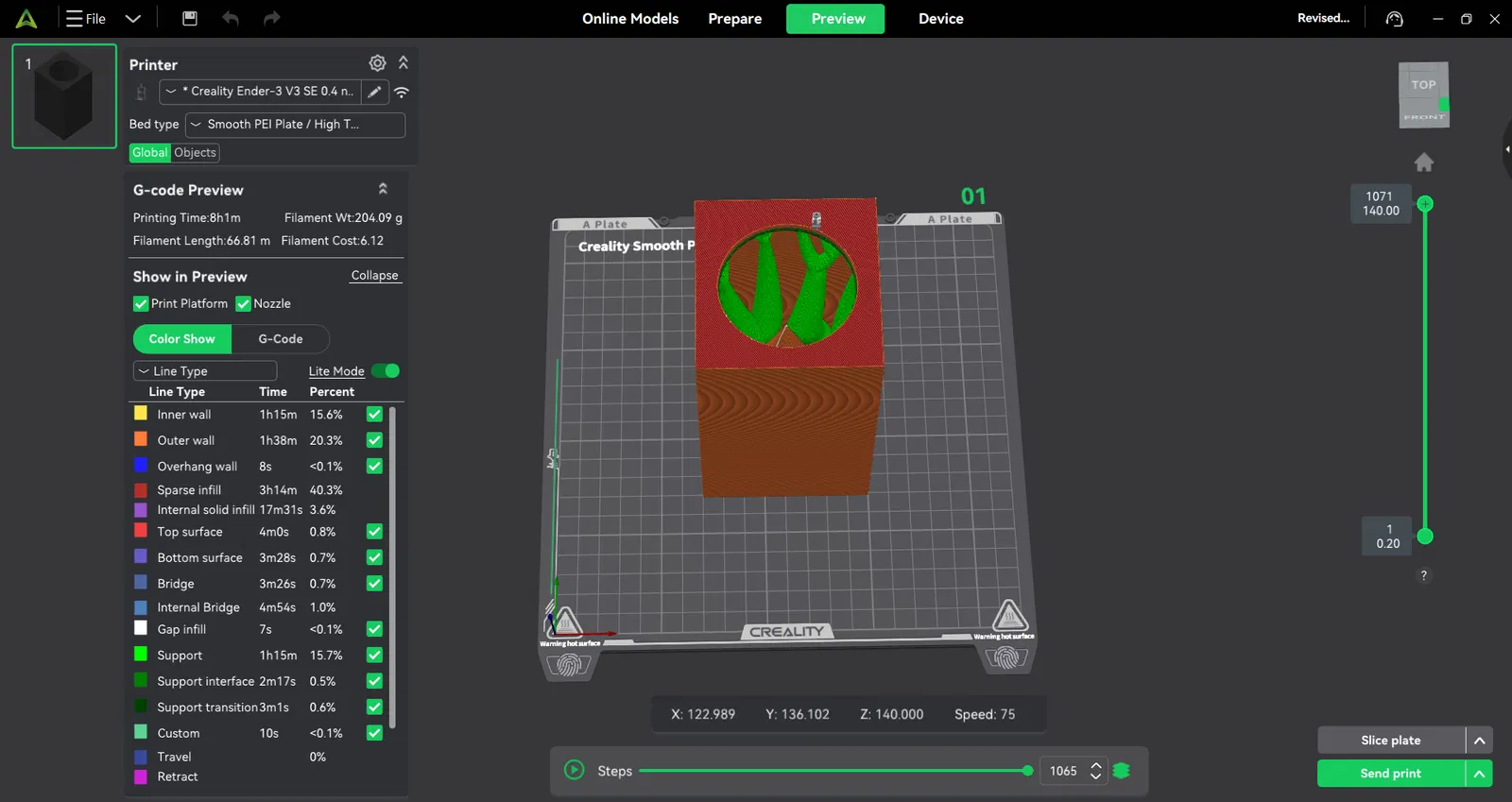 Mình khuyến nghị dùng filament ABS màu đen20–50% infill để nó chịu nhiệt tốt hơn một chút. Laser công suất nhiều watt có thể sẽ làm chảy xuyên qua nếu chiếu liên tục trong vài phút. File .gcode mình upload đang để 20% infill với Hybrid Tree Supports ở bên trong. Bạn có thể dùng file .STL nếu muốn chỉnh lại các thông số.