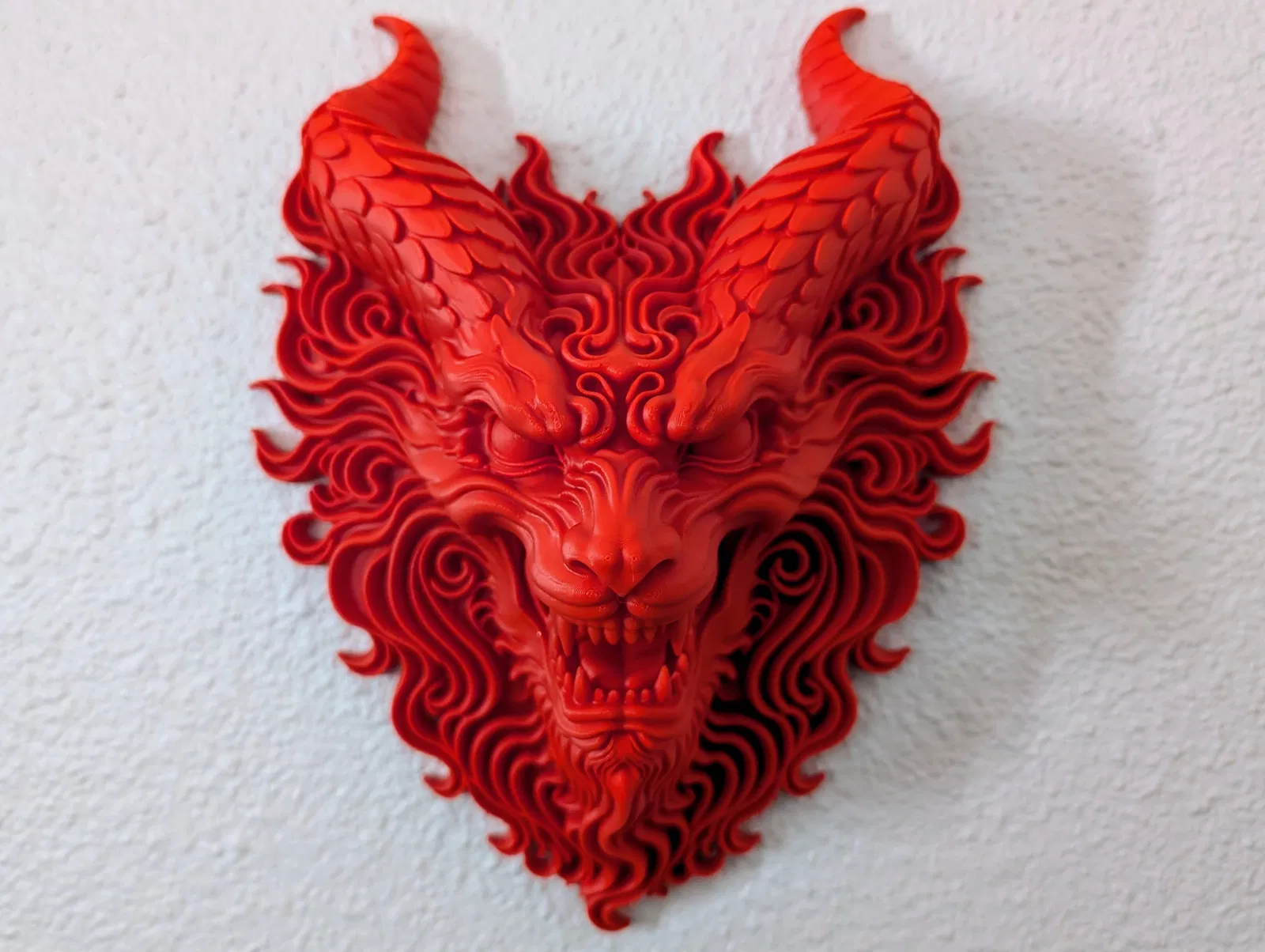 Mẫu đầu rồng lửa treo tường với mặt lưng phẳng để dán băng keo 2 mặt hoặc mounting putty. Chi tiết vảy, sừng và ngọn lửa đổ bóng đẹp mắt, nhẹ và bền, hợp decor phòng gaming/studio.