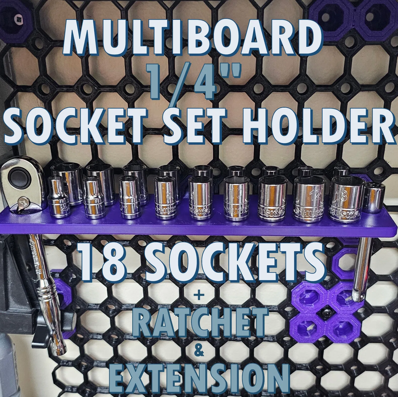 Khay giữ “Multiboard 1/4" Ratchet Set Holder” giúp sắp xếp bộ ratchet 20 món: giữ 18 sockets, 1 ratchet và 1 extension. In phẳng không cần supports, gắn Multiboard bằng 3 snaps; mẫu rộng 225mm (xoay 45° để vừa bed 200x200).