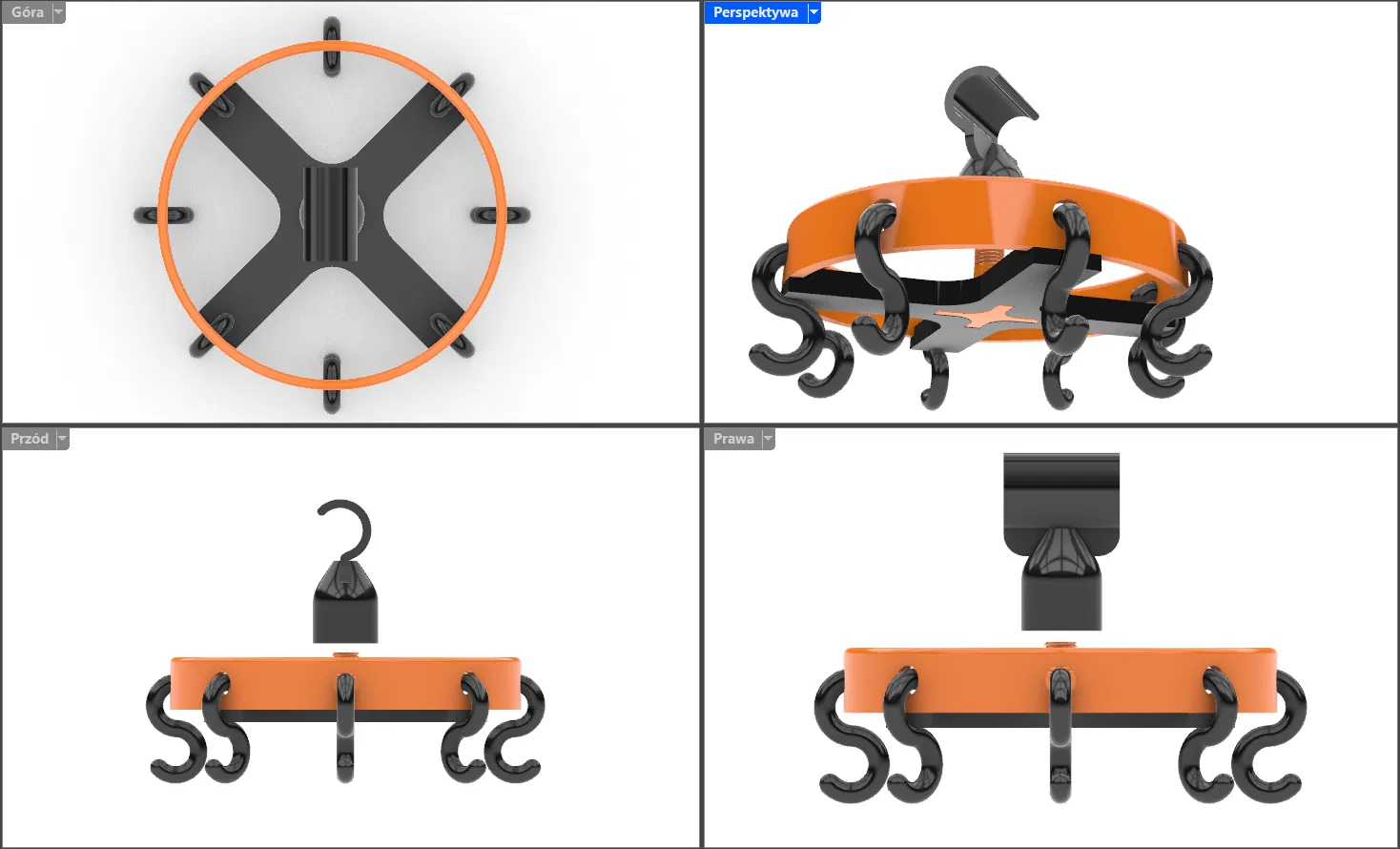Giải pháp carousel xoay 360° cho thanh treo tủ $\phi 25$mm: lắp dạng ren không cần keo, chịu lực tốt, gọn gàng treo tối đa 8 túi/balo hay phụ kiện. Có file STEP để remix và 3MF để slice nhanh.
