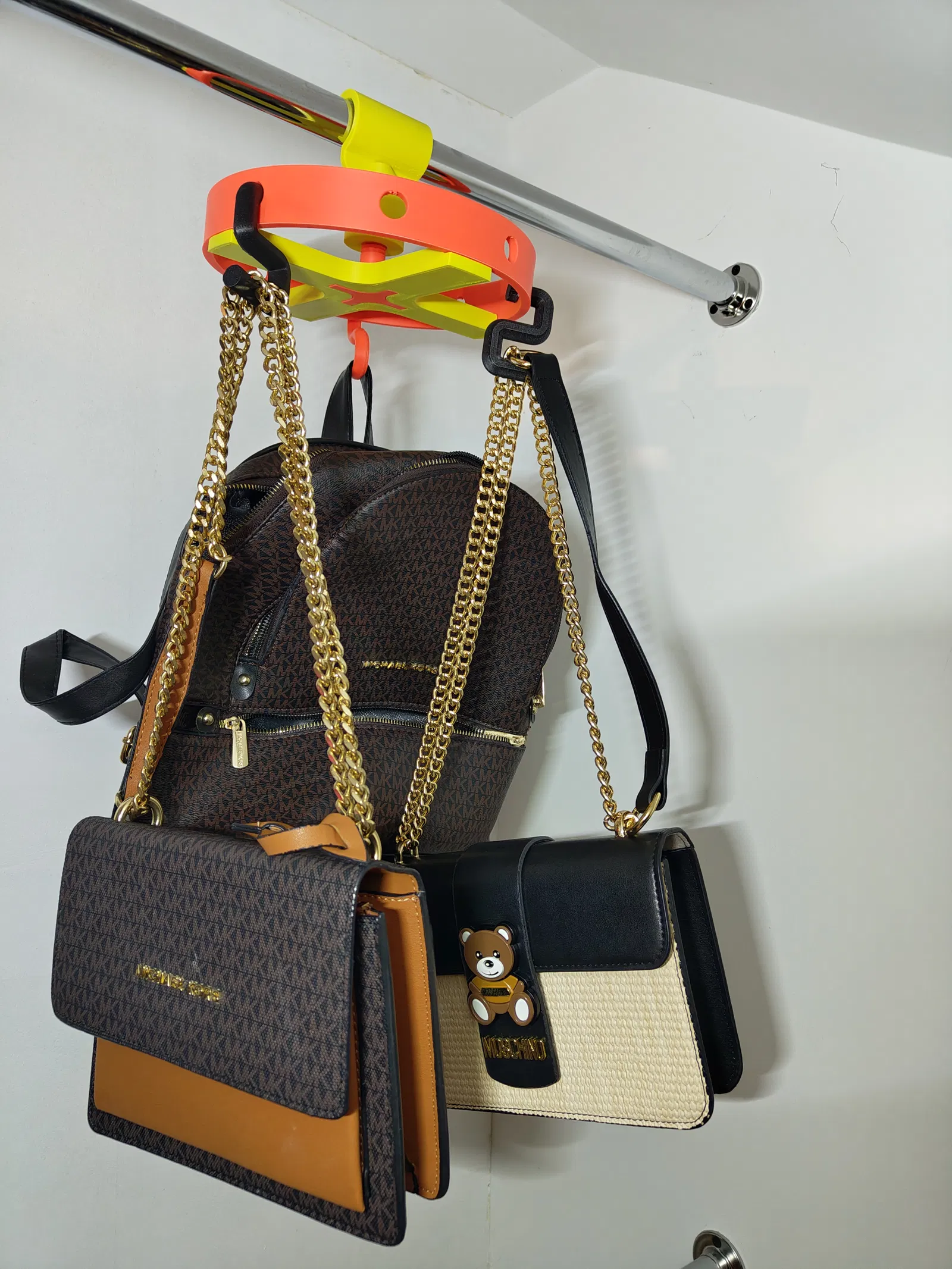 Bạn đang ngán cảnh túi xách với balo cứ chất đống dưới sàn tủ đồ? Mẫu Rotating Bag Carousel này là giải pháp dạng module, chịu lực tốt, được thiết kế riêng cho các thanh treo tủ quần áo chuẩn 25mm ($\phi 25$).
