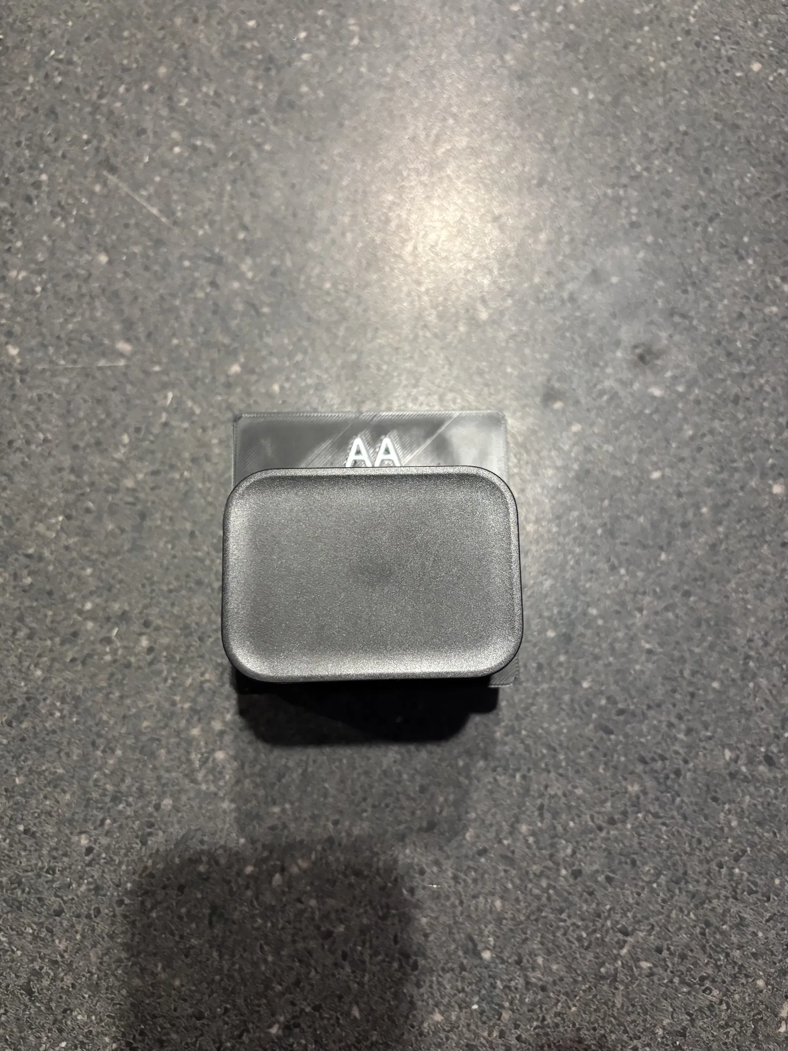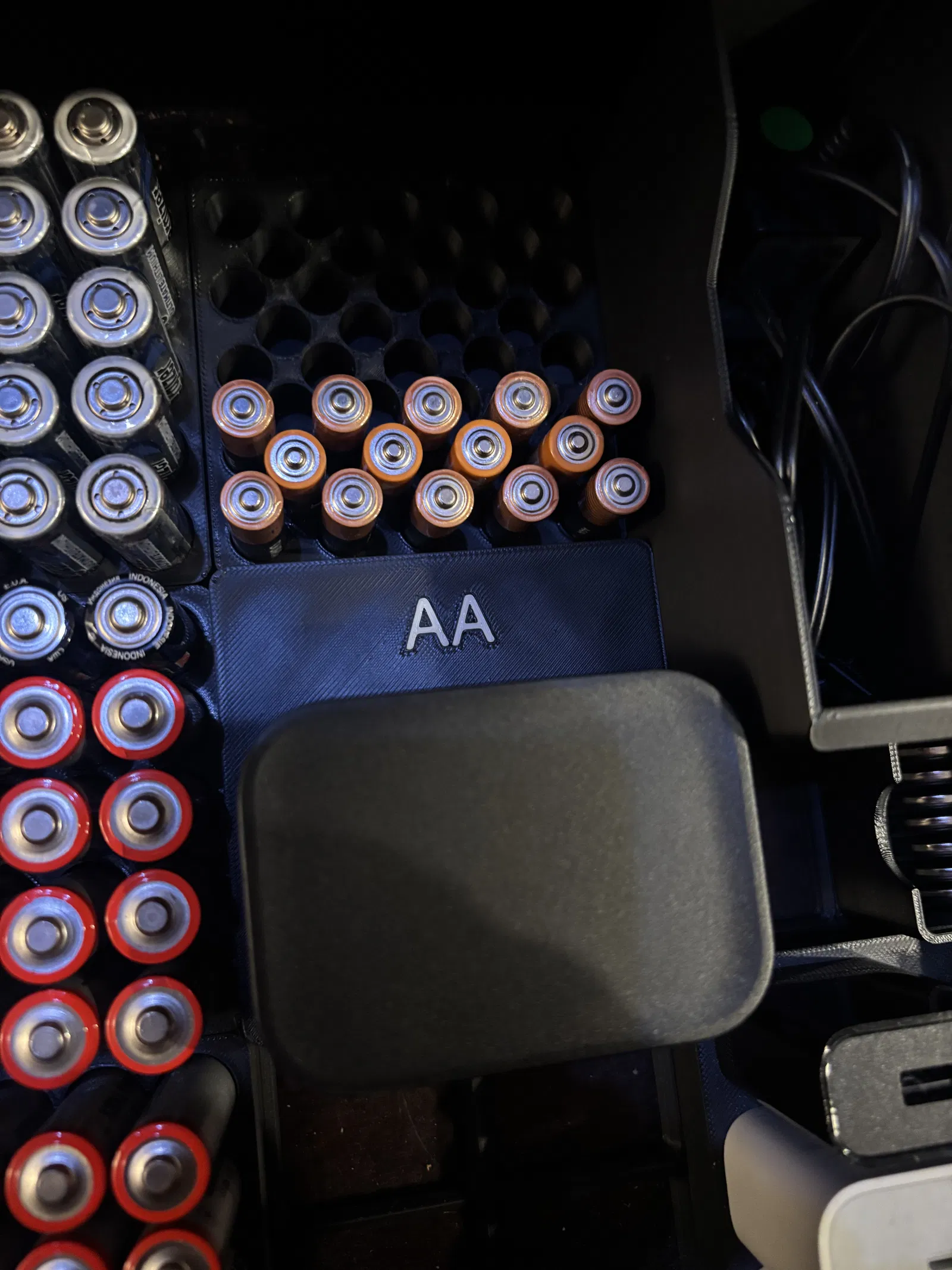 Khay Gridfinity để cất bộ sạc pin, có lỗ khoét đặt lệch để mở nắp dễ hơn và chừa chỗ dán nhãn AA/AAA. Có kèm file .f3d với tham số cho nhãn và độ sâu/chiều cao.