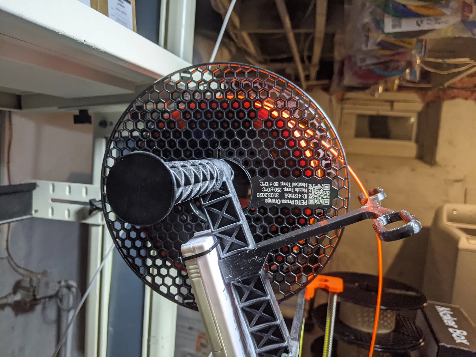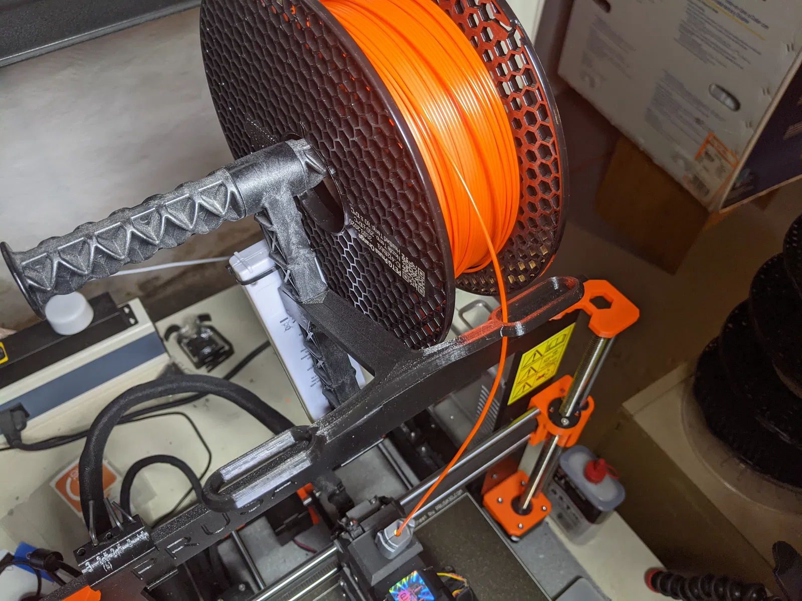 Bộ dẫn filament kẹp lên spool holder zin của MK3(S/S+), tăng khoảng hở phía trên extruder để không bị cấn và giảm cảm giác filament bị gò khi in gần đỉnh. Tối ưu cho cuộn Prusament; cuộn lớn hơn có thể kẹt.