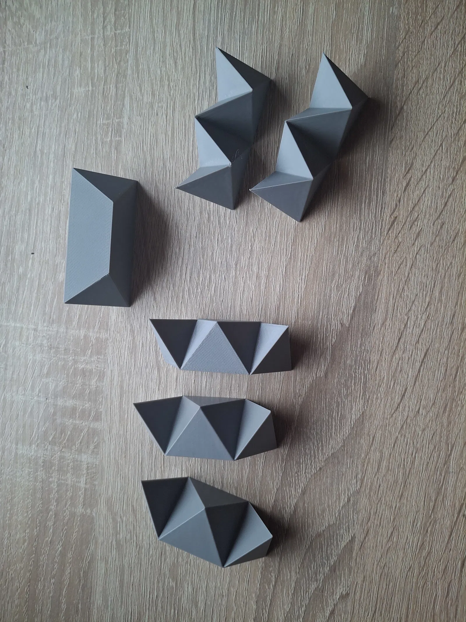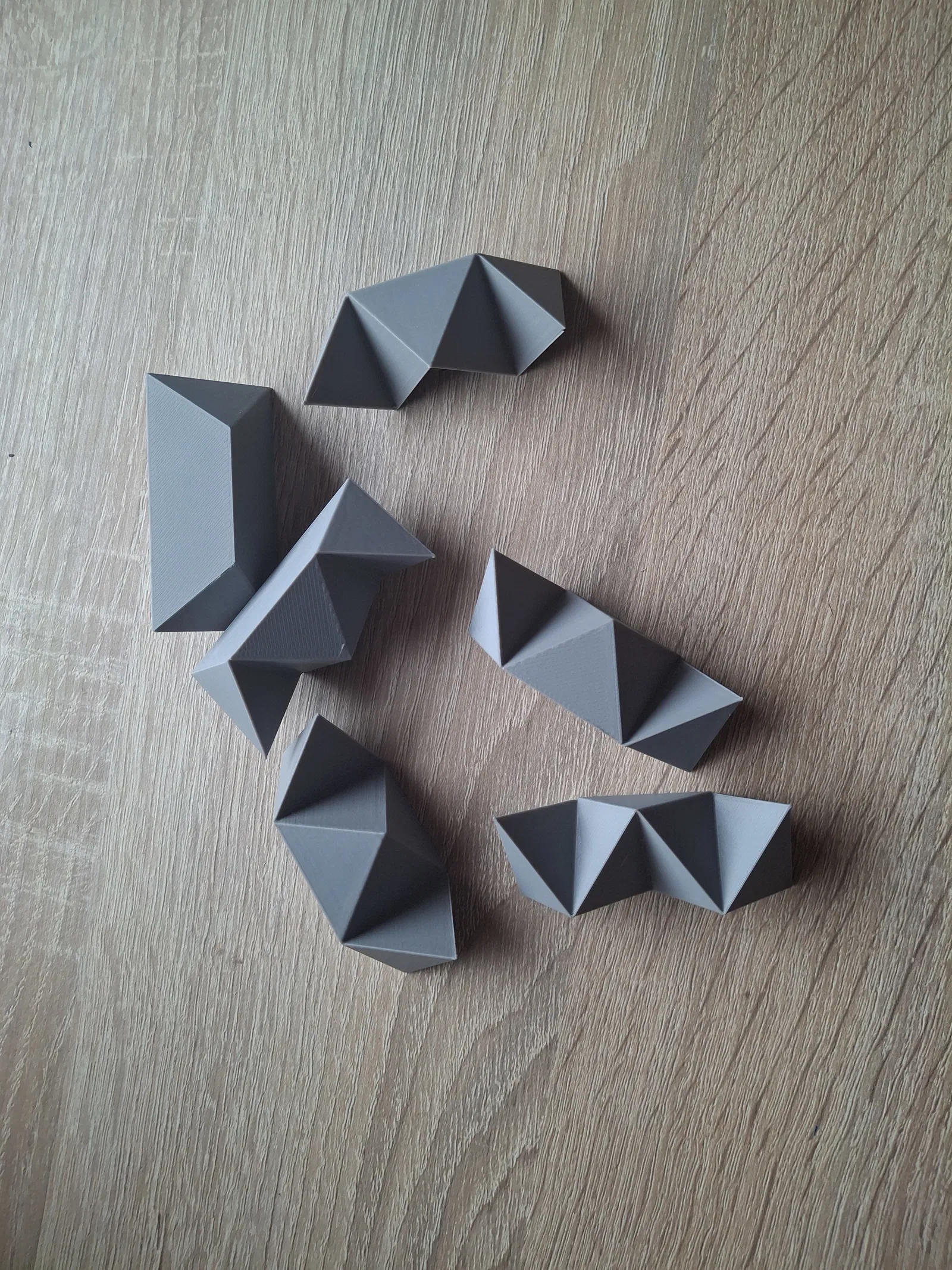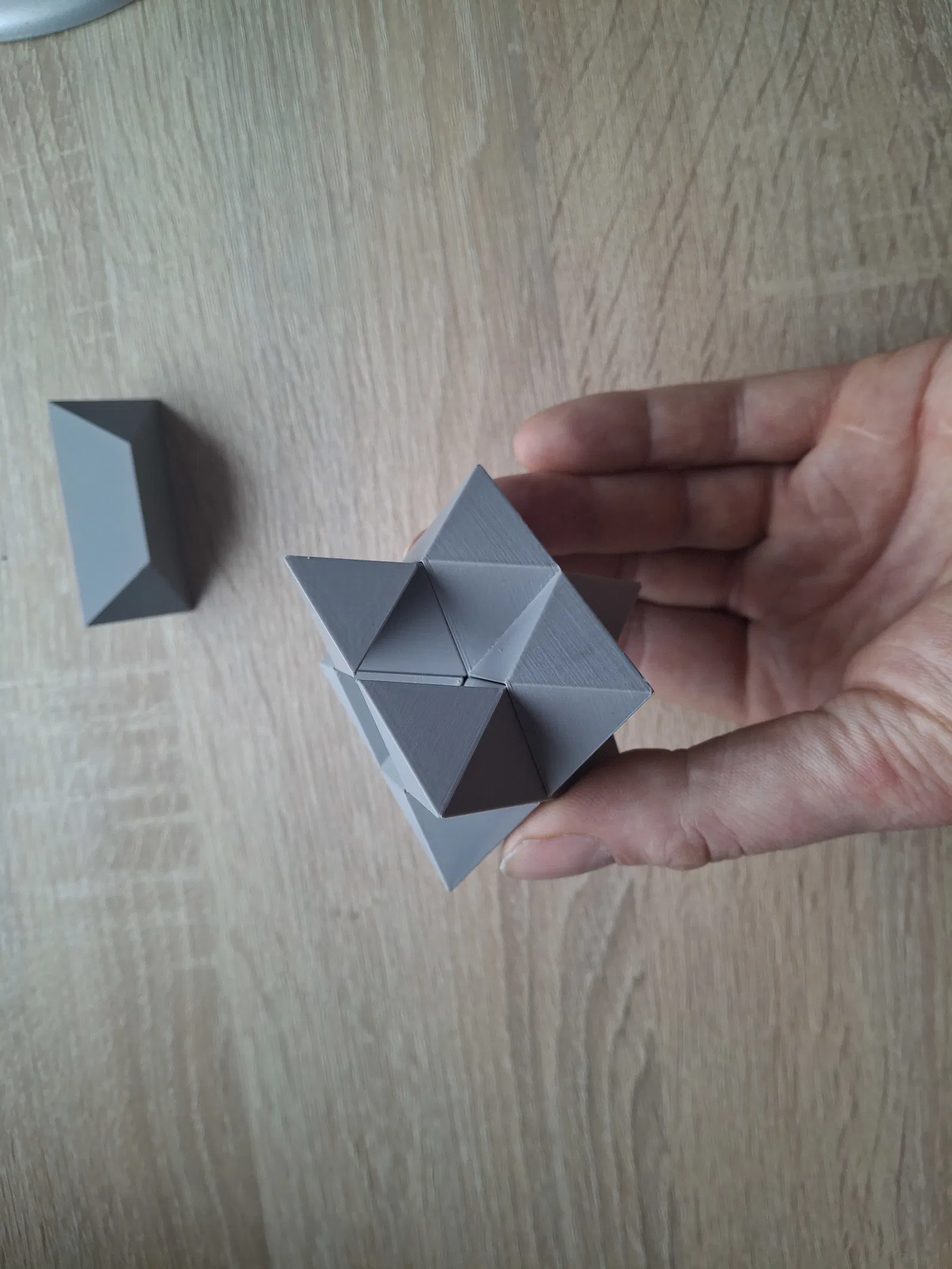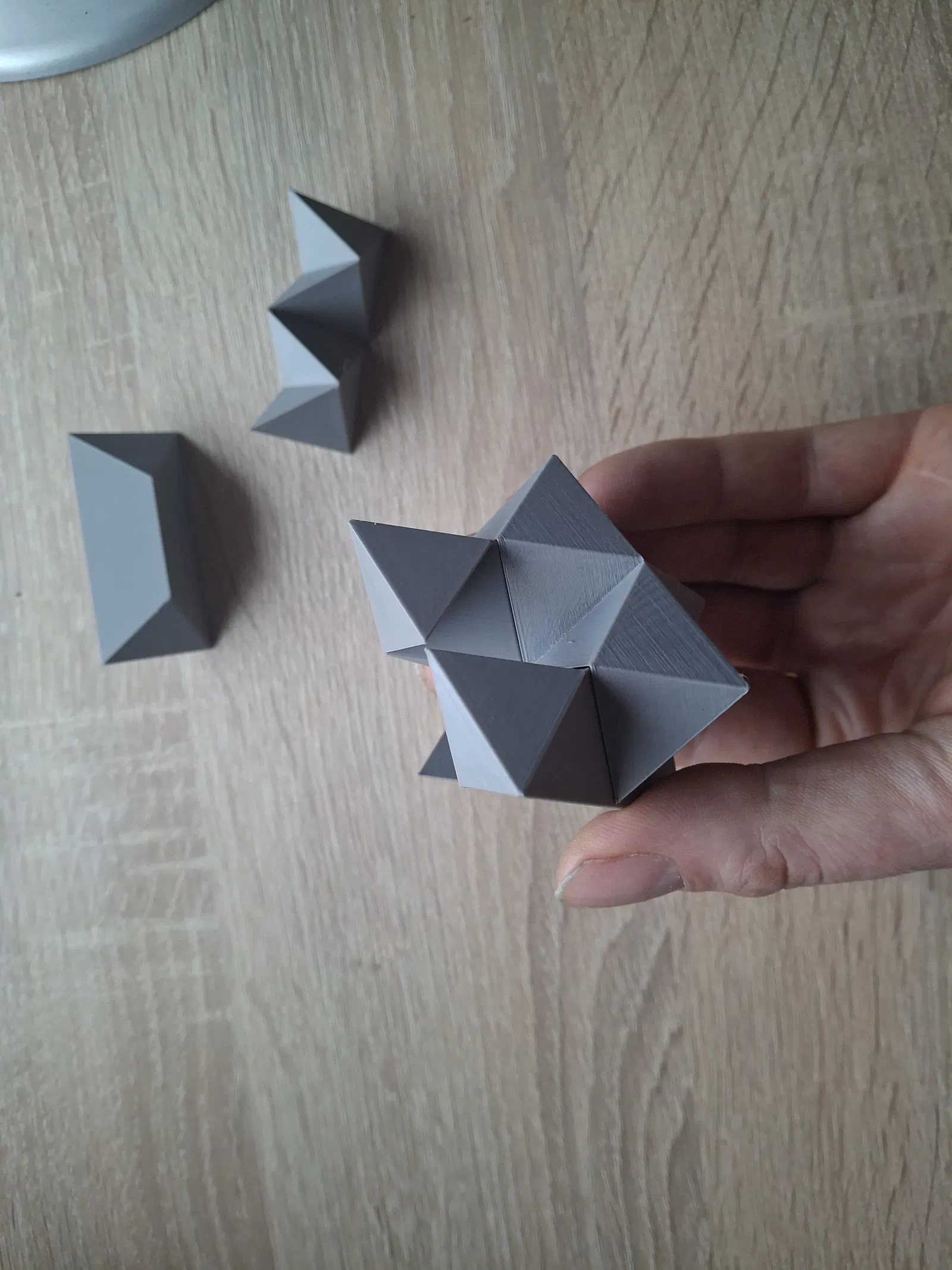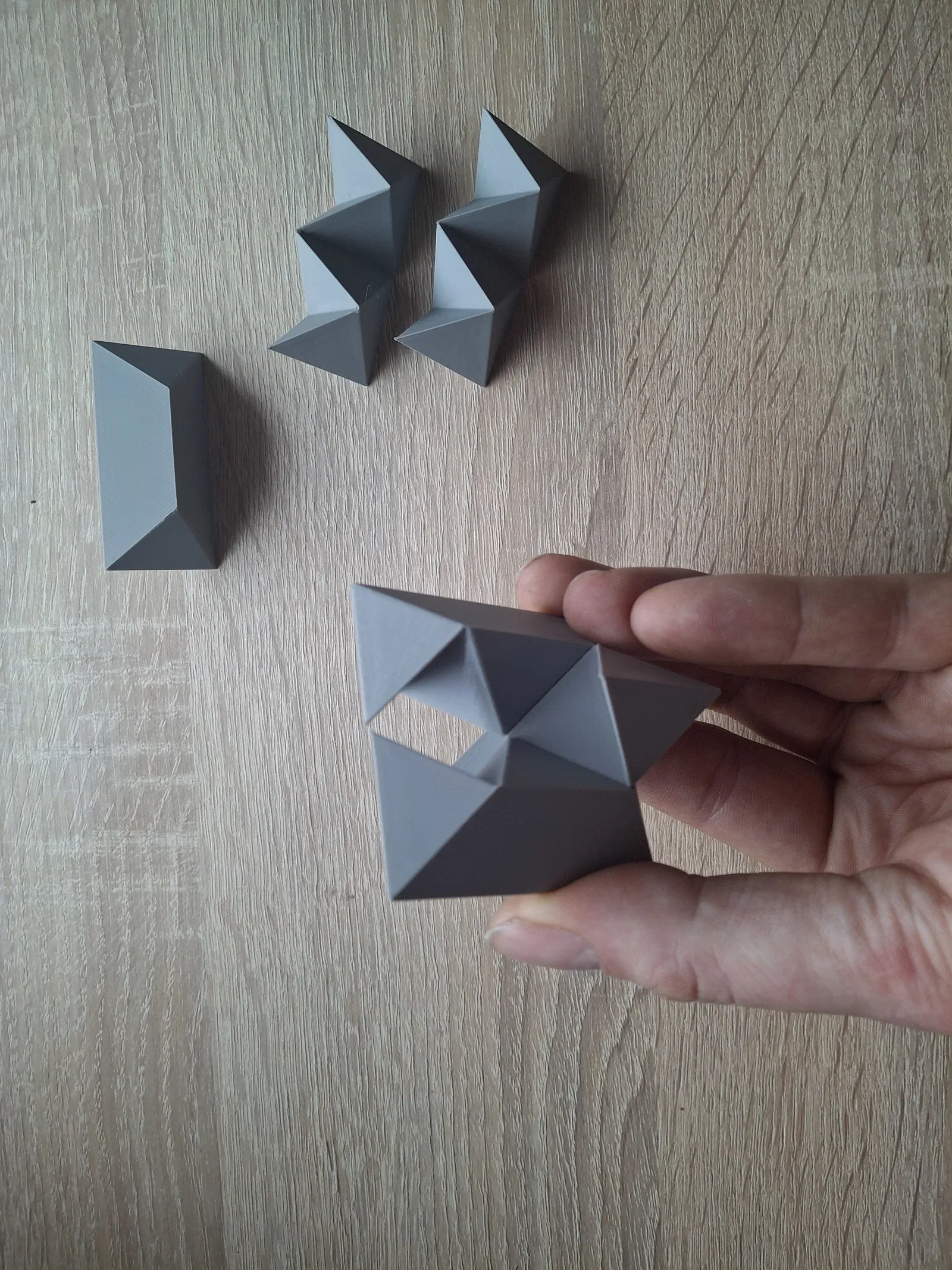 Hlavolam dạng tinh thể cổ điển (brain teaser). In bằng PLA với 2 perimeters, 10% infill và layer 0.15mm là ổn. Gồm 3 chi tiết part 01, 2 chi tiết part 02 và 1 chi tiết part 03; xem hình để lắp ráp.