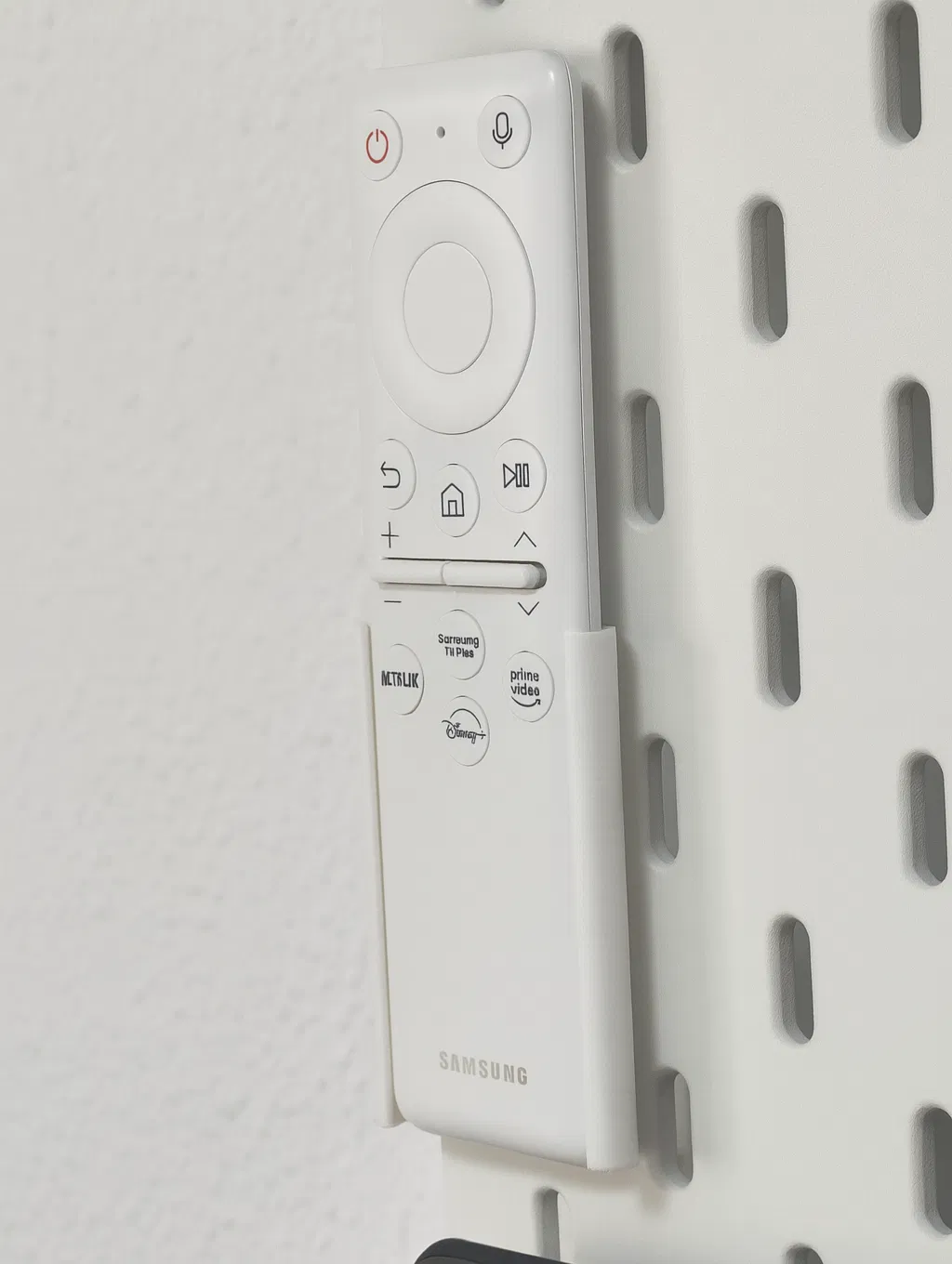 Ngàm/kệ được thiết kế riêng để treo remote TV Samsung mẫu TM2261S lên tấm pegboard đục lỗ IKEA Skadis.