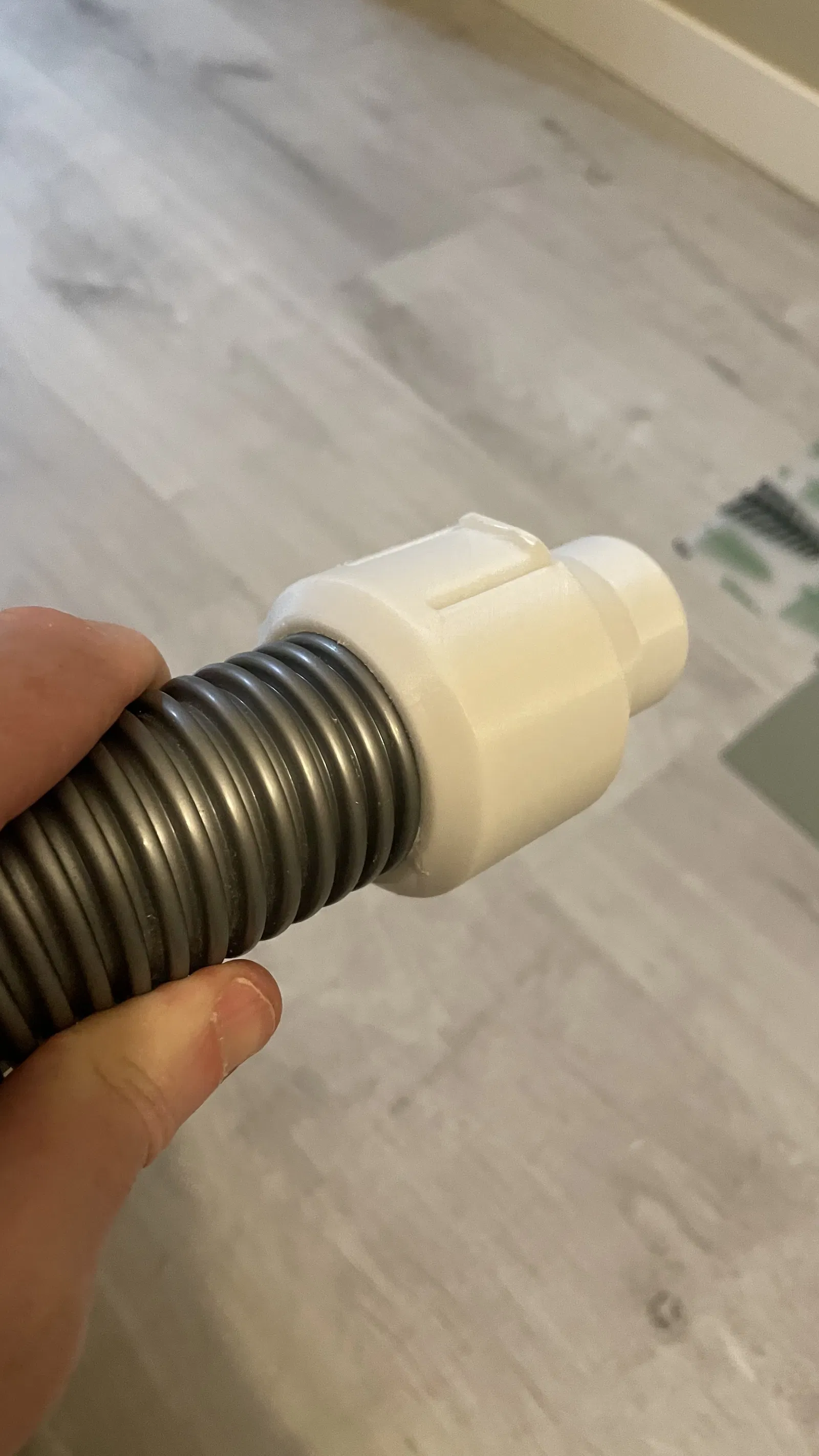 Mấy cái ngàm nhựa trên đầu nối ống hút zin của máy hút bụi Nilfisk Power P10 theo thời gian bị gãy, làm ống tuột ra chỉ cần kéo nhẹ. Vì nhà sản xuất không bán rời món này (bắt mua nguyên bộ ống mới, rất mắc), nên mình quyết định làm lại adapter.