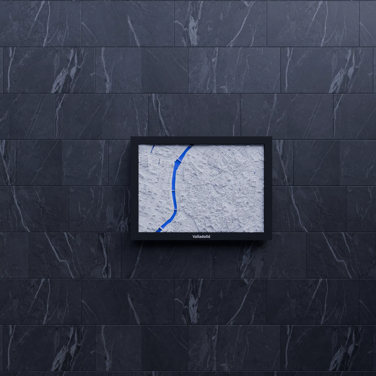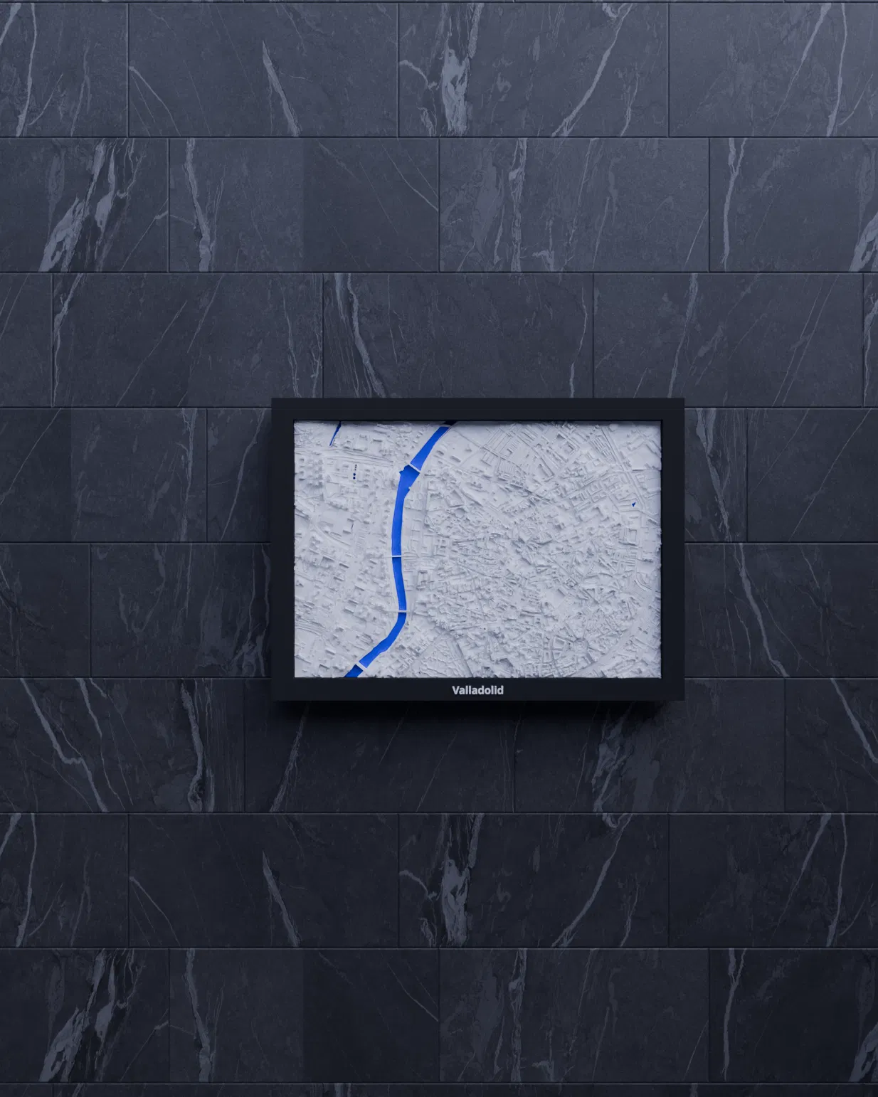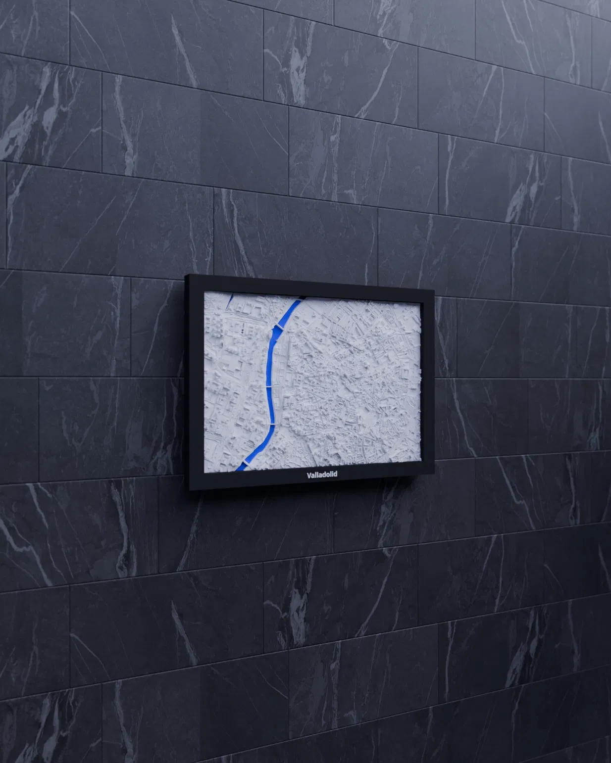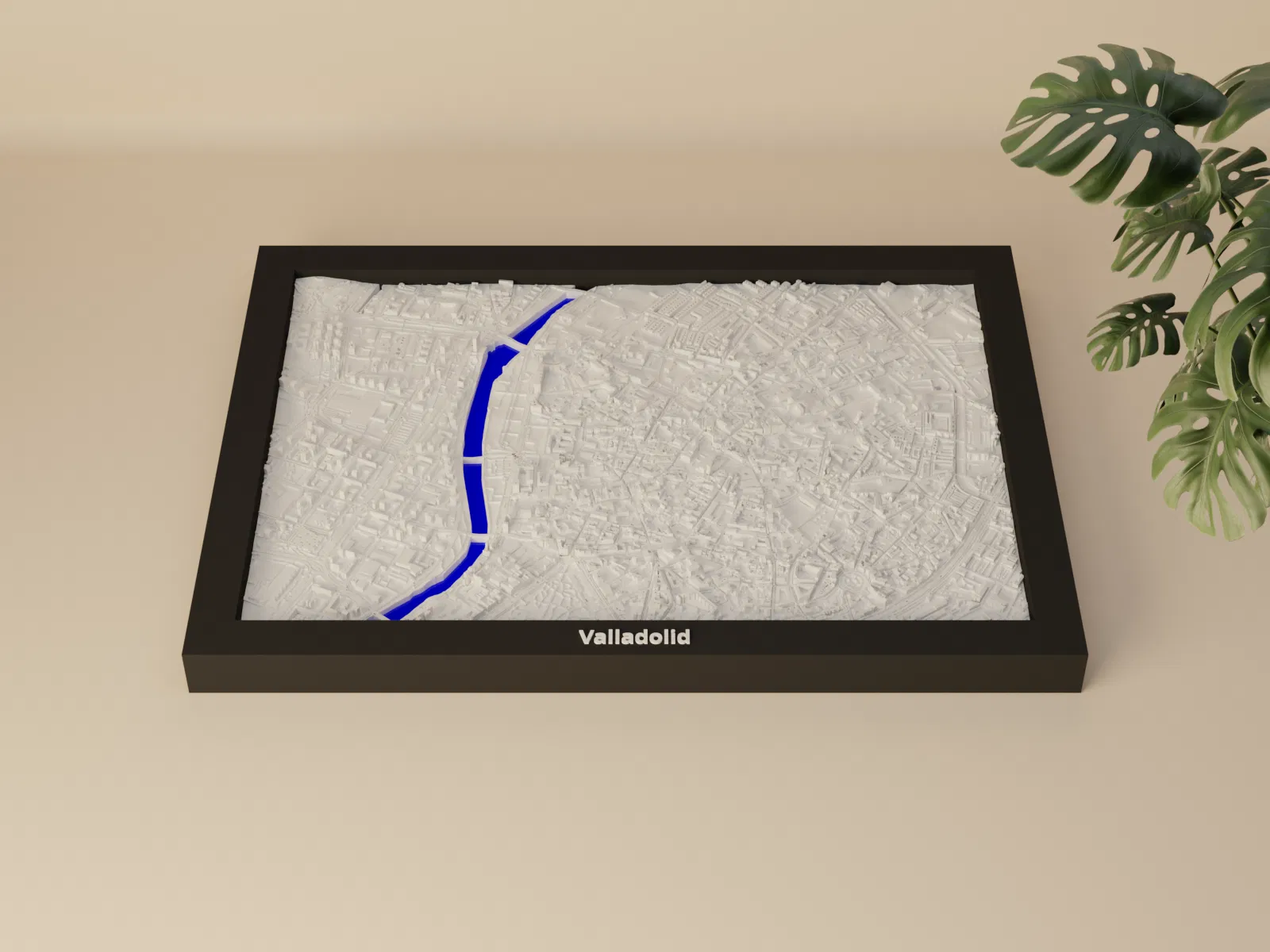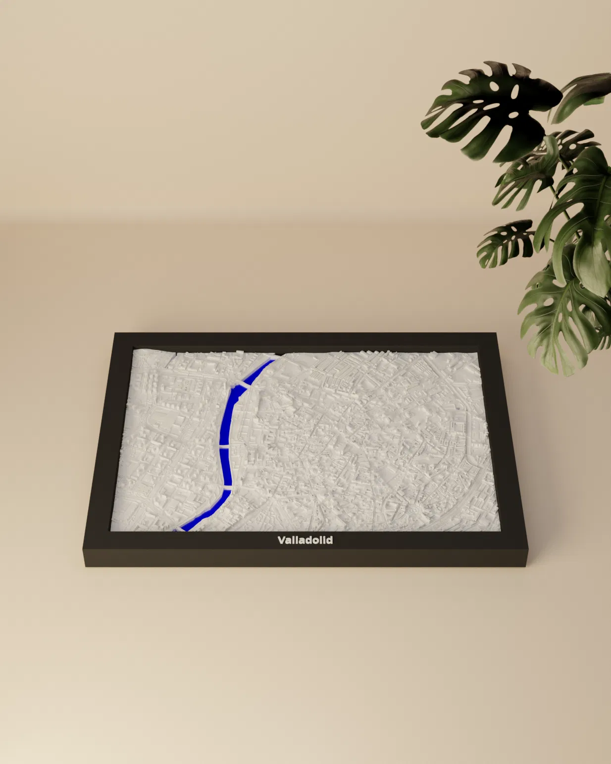 Mô hình thu nhỏ địa hình Valladolid (Tây Ban Nha) in 3D, dựng từ dữ liệu địa lý. Khu vực 2.818 km x 1.967 km được thu về 170.5 x 119.5 mm (~16526:1), kèm nhiều frame có lỗ treo.