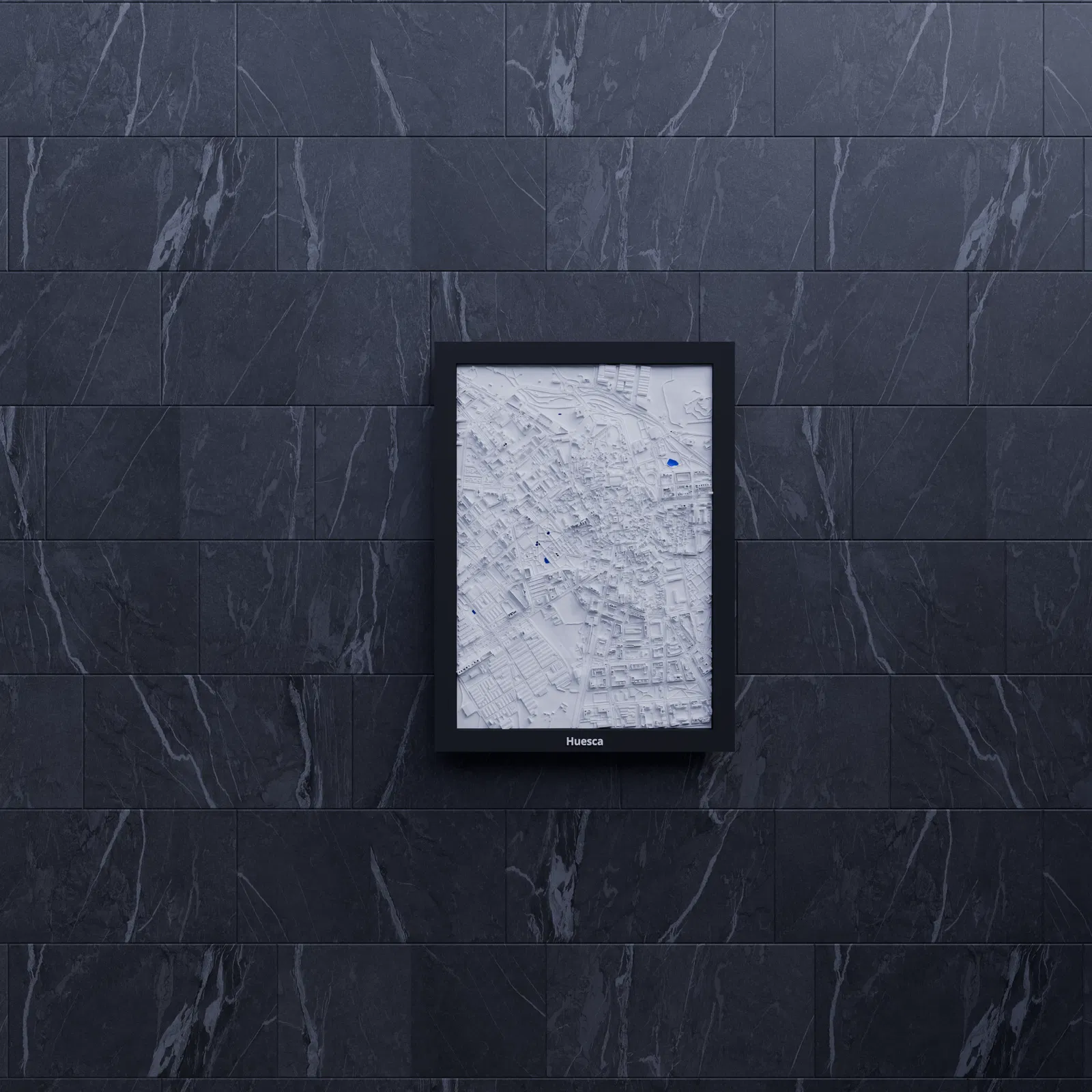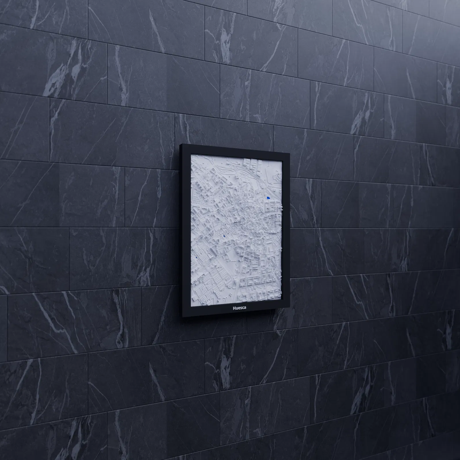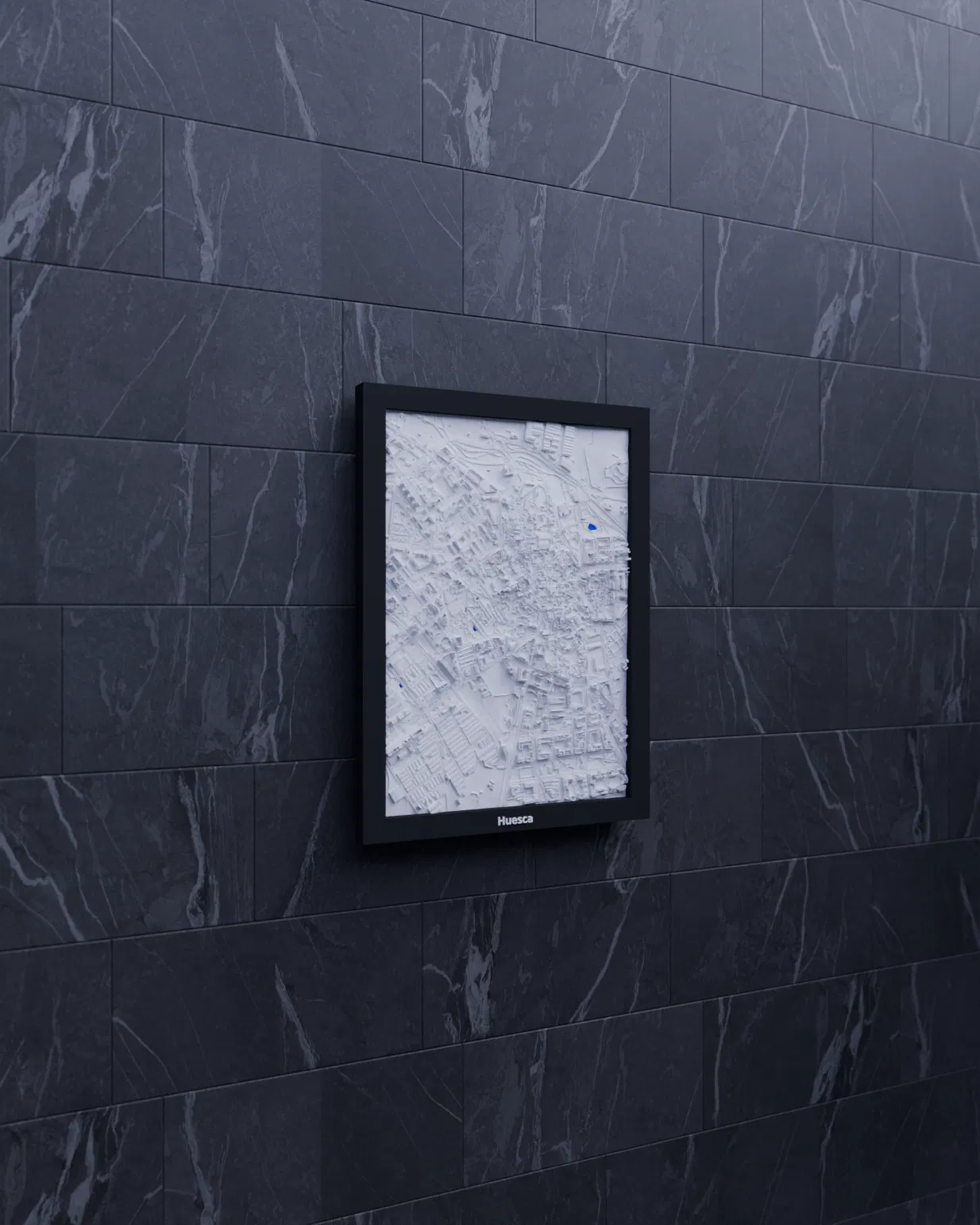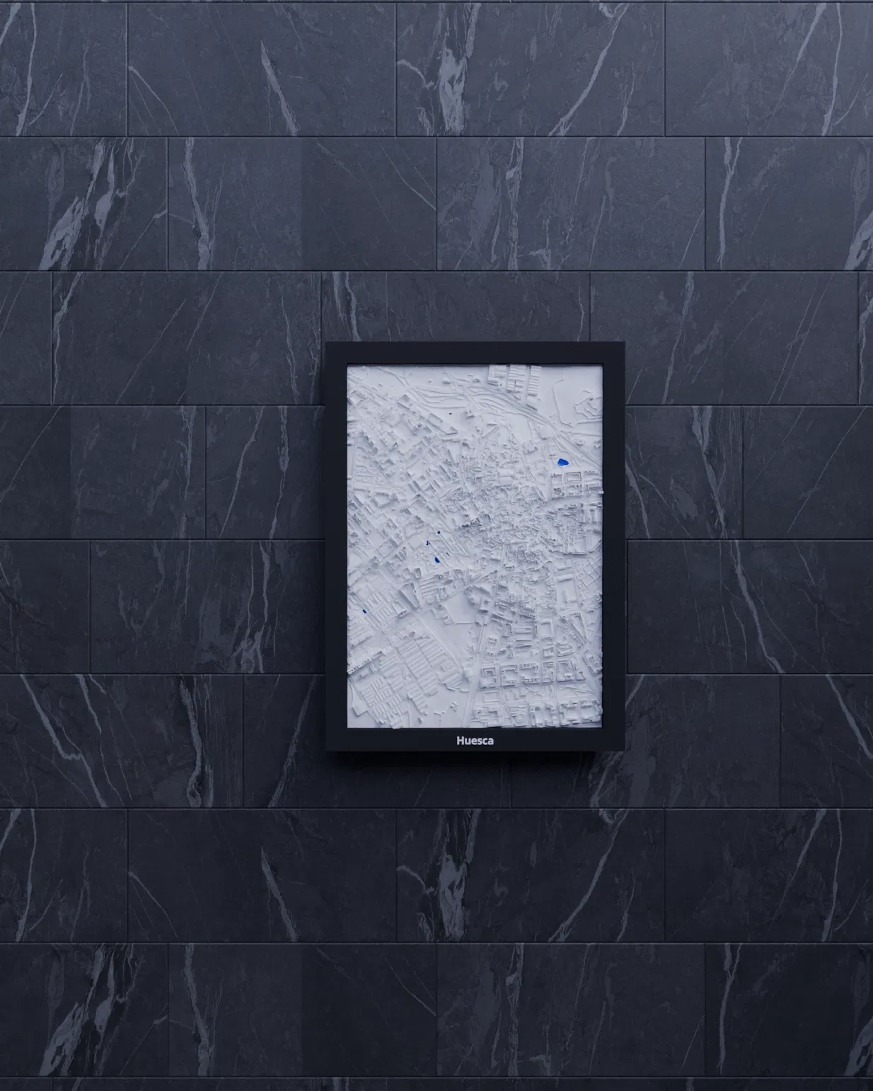 Mô hình địa hình thu nhỏ Huesca (Tây Ban Nha) in 3D, dựng từ dữ liệu địa lý để tái hiện terrain chân thực. Kèm nhiều frame có lỗ treo, phù hợp trưng bày, học tập, làm quà tặng hoặc decor bàn/treo tường.