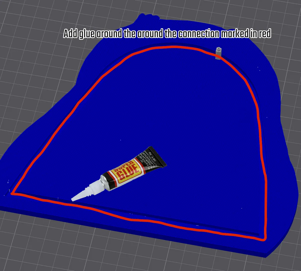 Prep: Đảm bảo đã gỡ sạch toàn bộ supports khỏi phần thân.Glue: Chấm một lượng nhỏ keo vào các rãnh bên trong của mặt trước và mặt sau.