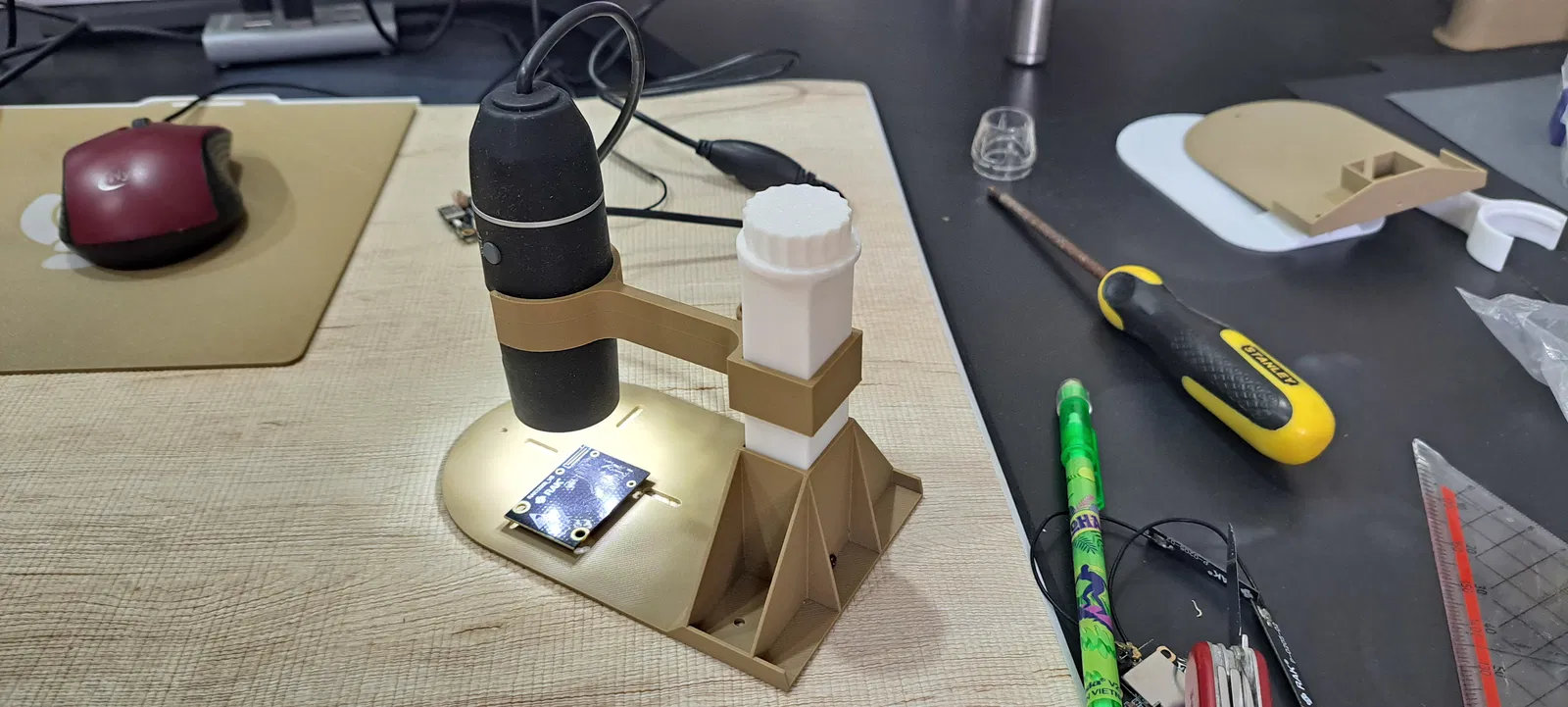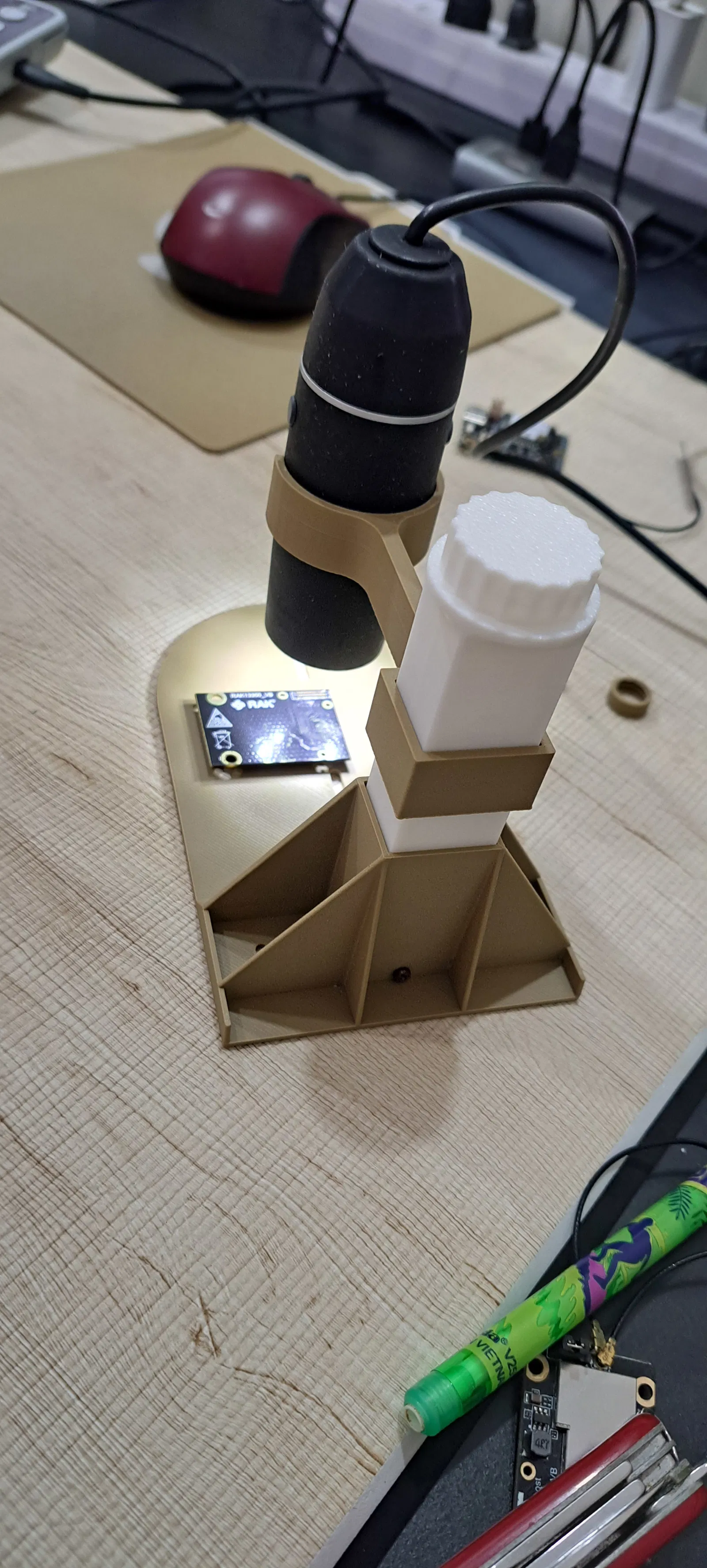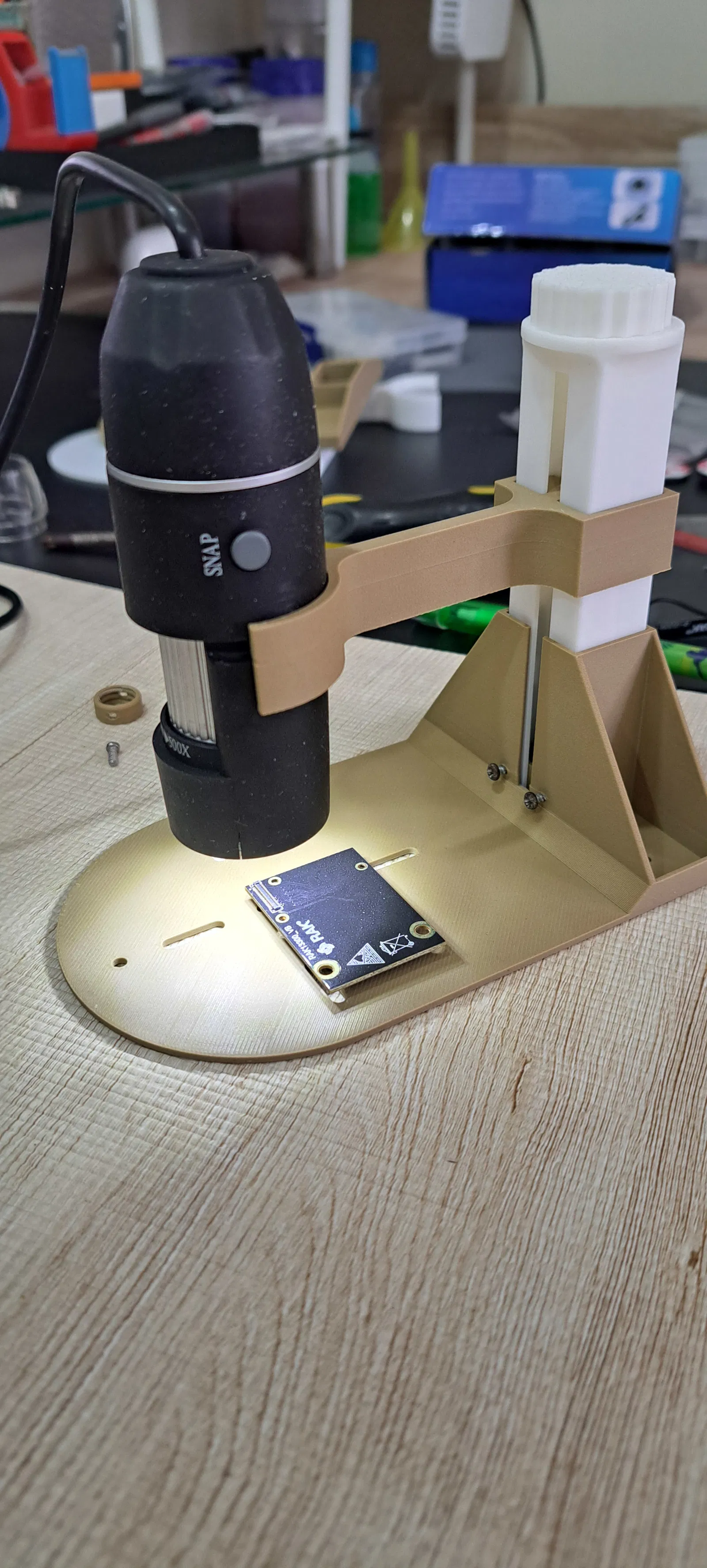Chân đế in 3D cho USB microscope, cho phép chỉnh cao theo phương dọc để canh nét dễ và hình ảnh ổn định hơn khi soi PCB, kể cả ở mức 500x. Lắp ráp đơn giản với 3 vít tự ren ngắn và kẹp camera vào ngàm.