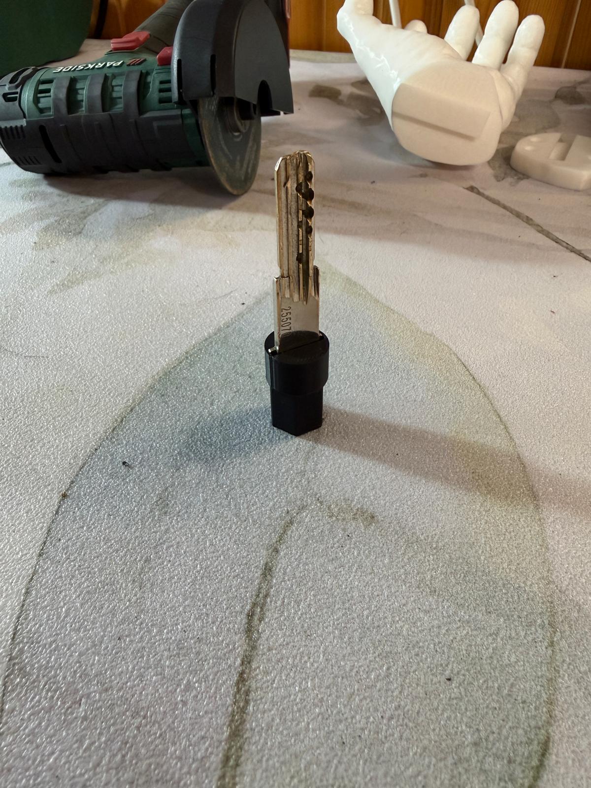 Bạn sẽ cần tháo phần chìa ra khỏi vỏ nhựa zin (chỉ cần gỡ cái chốt nhựa bằng cây bút) và mài phần đáy của chìa bằng dũa mềm (flex file), như trong hình. Mình sẽ up một file với kích thước chính xác.