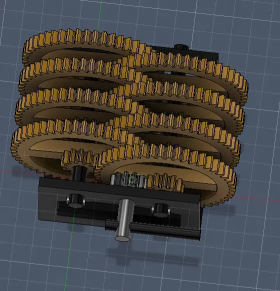 Ai quyết định in mẫu này thì trước tiên nên gắn cái trụ (cylinder) có bánh răng nhỏ đi kèm vào trong thân (body), rồi luồn tay quay dạng trụ (cylindrical handle) qua cái lỗ trên thanh (rod). Sau đó gắn tất cả các bánh răng màu vàng lên các trục đen (black rods) và lắp các trục đó vào khung (frame). Cuối cùng lấy các trụ nhỏ hơn (smaller cylinders) và đặt chúng vào các lỗ ở hai bên của thanh (rod).