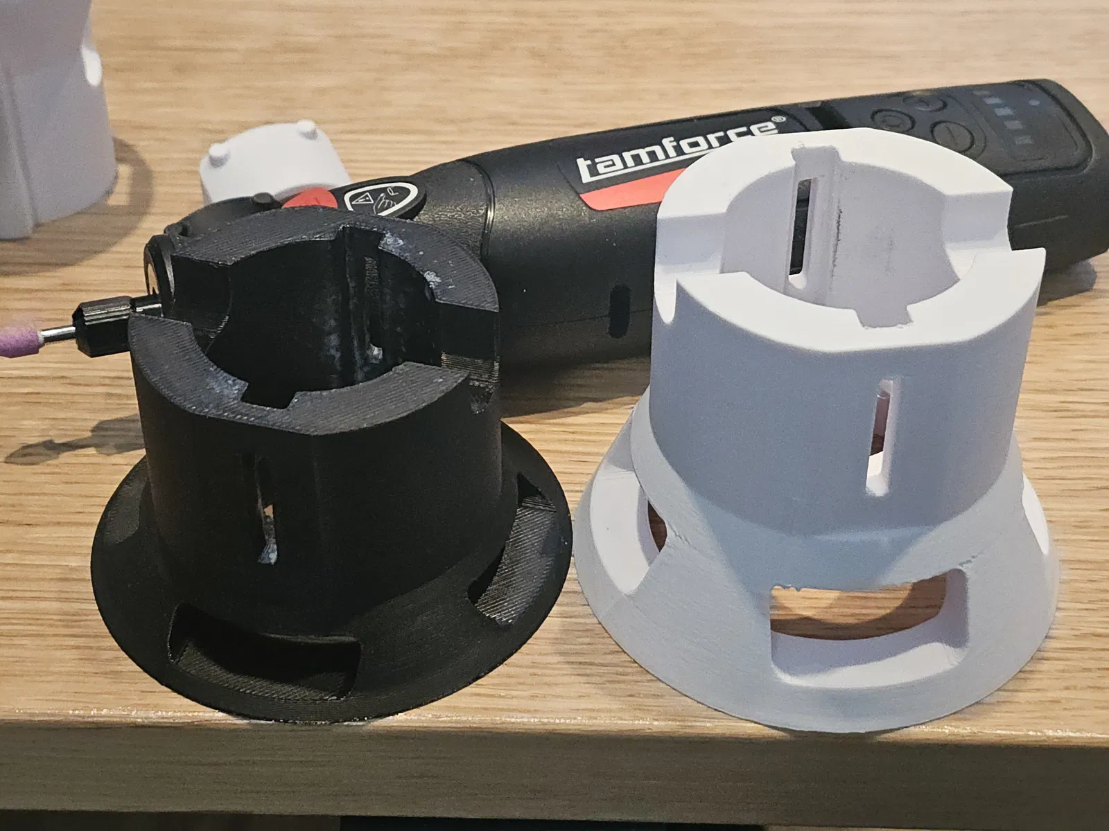 Adapter đổi Tamforce Cordless Rotary Tool thành router, có 2 phiên bản: bản dùng M3 nuts/bolts để chỉnh độ cao và bản cho attachments riêng. Cần supports; gợi ý in 0.2mm, PLA, infill 10% và 3 walls.