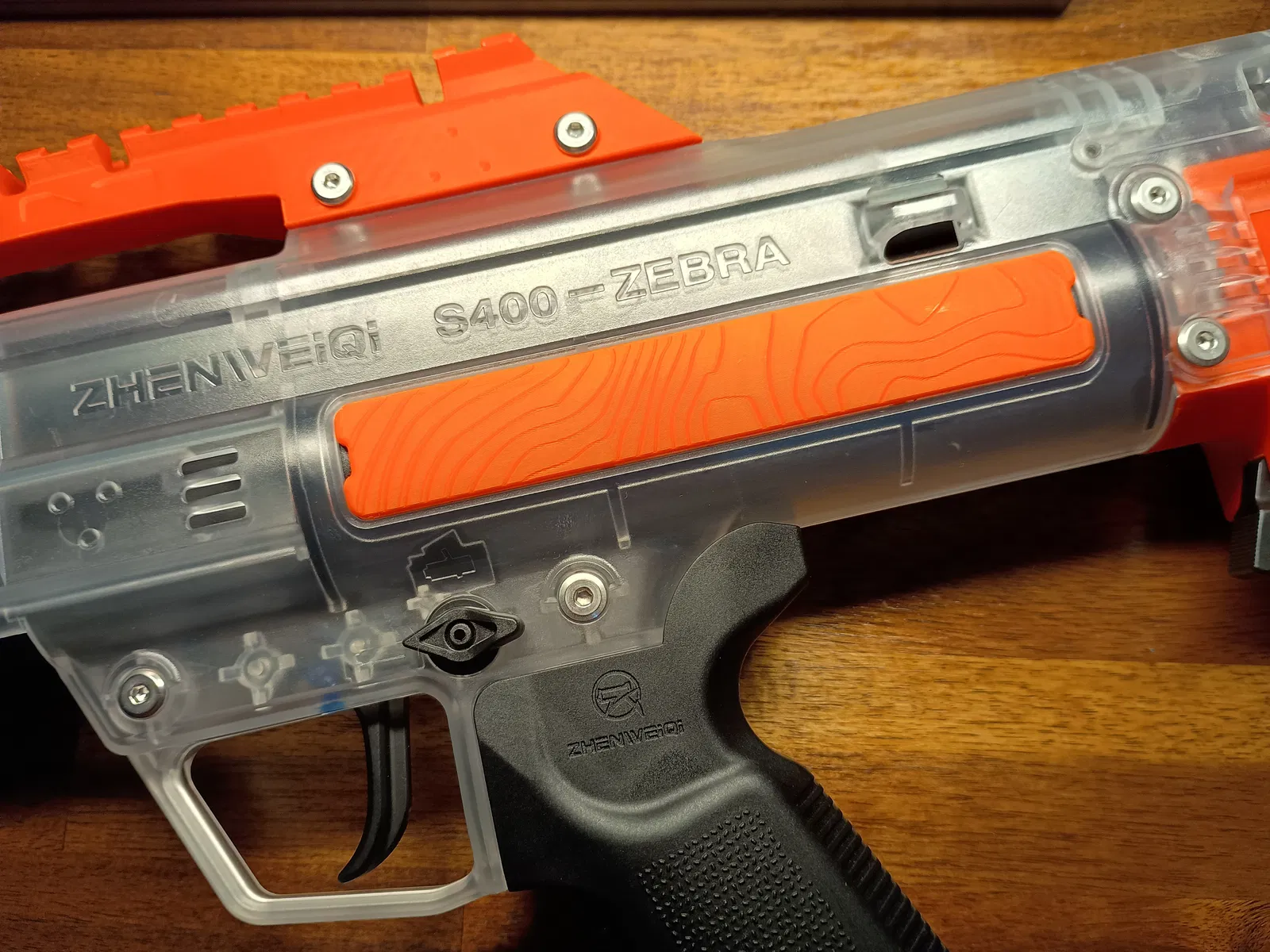 Ốp che trang trí cho phần plunger tube bị lộ trên ZWQ S400 Zebra/Red Hare, có hoạ tiết địa hình. Khuyên in kèm brim nếu khó bám bàn và dán cố định bằng băng keo 2 mặt, keo CA hoặc keo loãng khác.