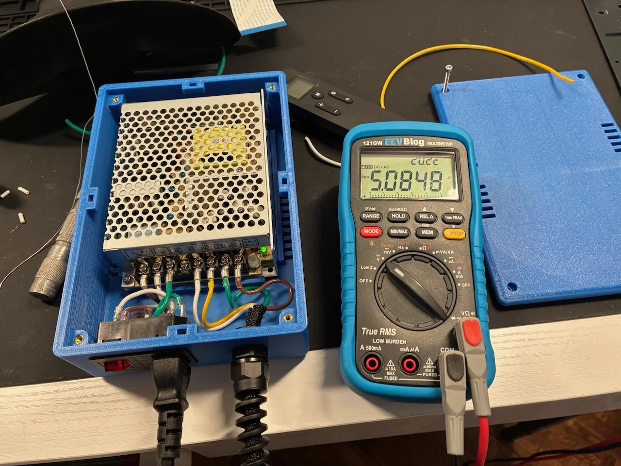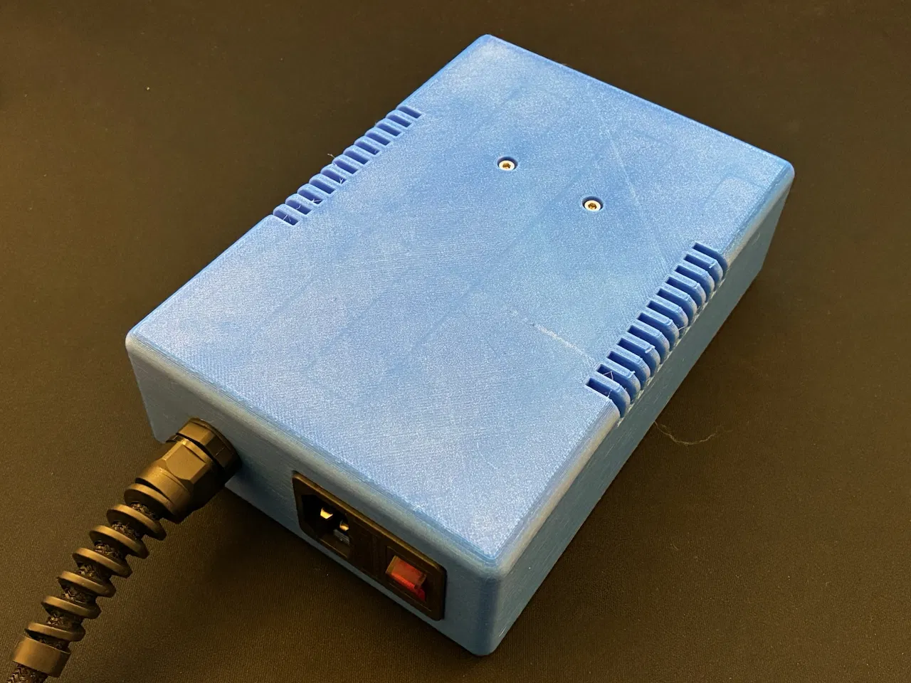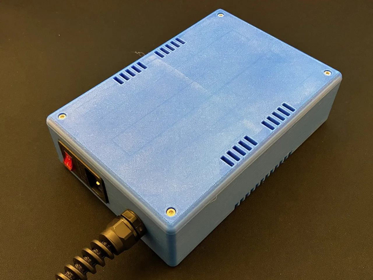 PSU nằm trong một phần đế có gân định vị bên trong hộp in, và có hai con bolt để cố định PSU. Tuyệt đối không dùng bolt dài ở đây vì có thể làm hư PSU! 6mm, không hơn. PSU còn được giữ thêm bởi nắp vỏ: trên nắp có các gân chạm vào mặt trên của PSU, giúp nó không bị tuột khỏi phần đế có gân, kể cả khi không có hai con bolt phía dưới. Nắp ăn khớp với đế bằng bốn góc, đồng thời còn có các “key” ở giữa mỗi cạnh. Với vài hộp PSU in 3D khác mình từng thấy bị flex, nhưng mẫu này thì sẽ không bị.