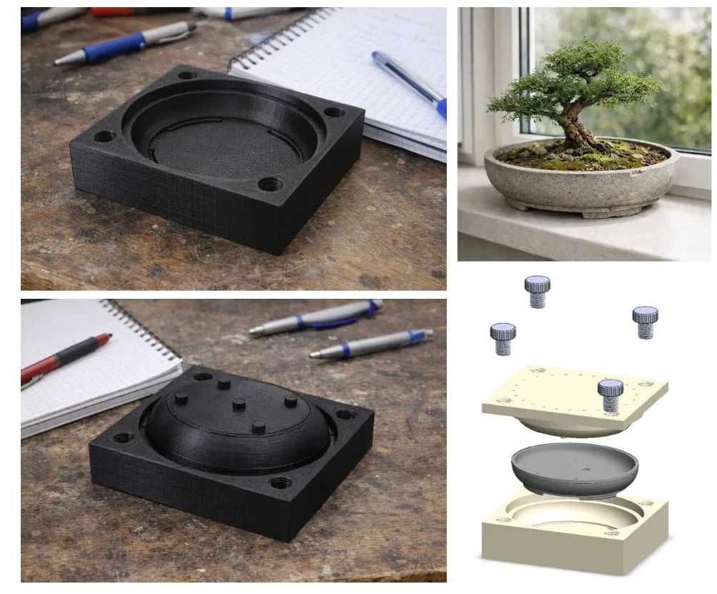 Khuôn bonsai pot mold in 3D bằng ABS, dùng để đúc chậu bonsai bằng bê tông hoặc ceramic. Đổ vật liệu vào phần dưới, đóng phần trên và siết bằng bu lông; vật liệu dư thoát ra qua lỗ phía trên.