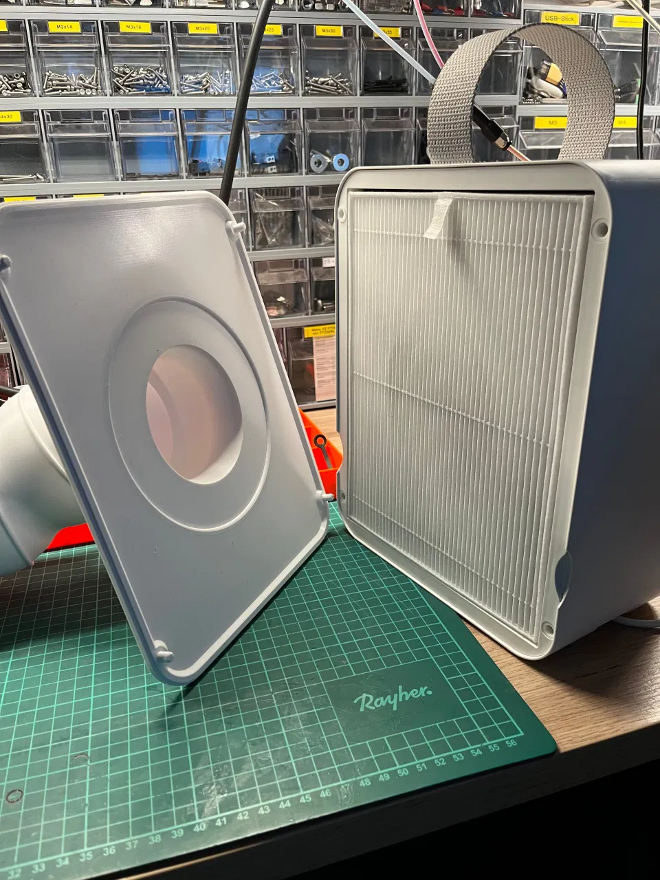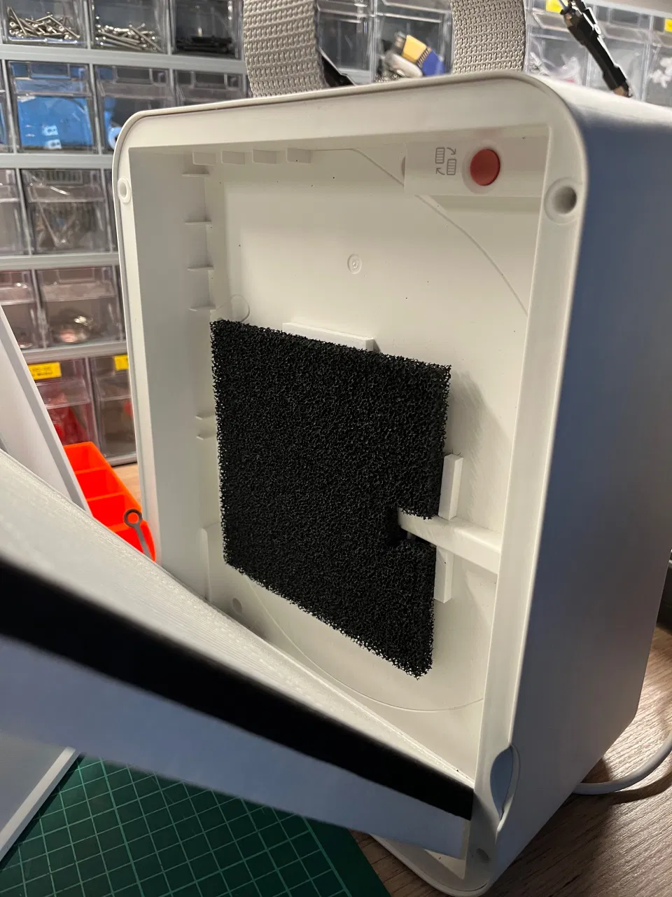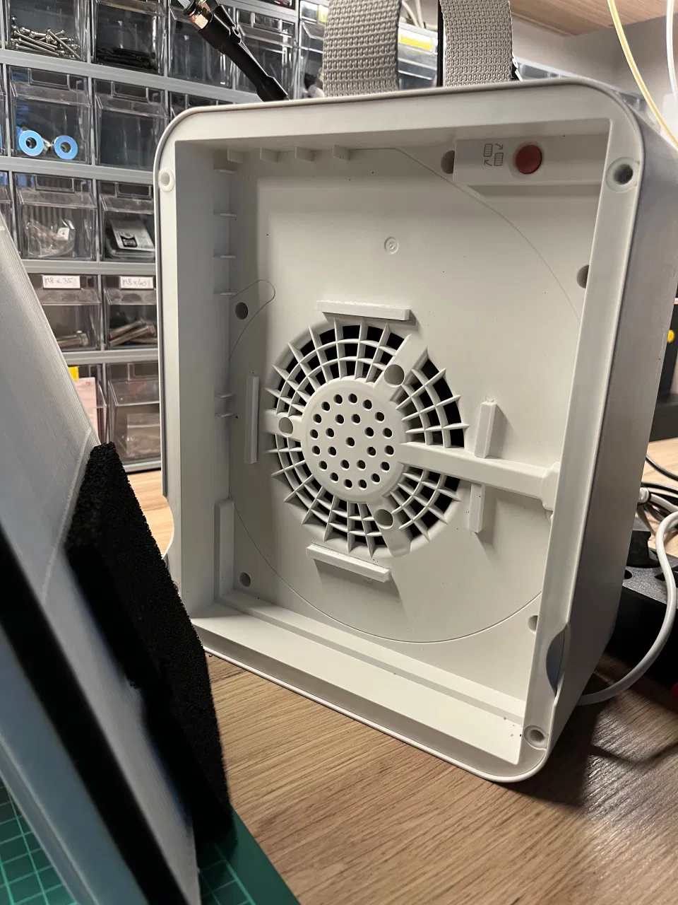 Trong quạt, mình có kẹp thêm một Aktivkohlefilter 130x130x10 mm nằm giữa màng lọc bụi và phần cửa hút. Để cố định, mình in 4 thanh nhỏ rồi dán quanh miệng hút.