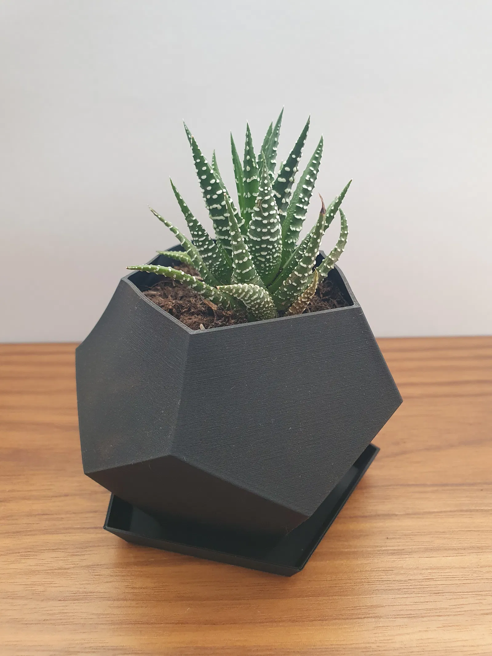 Mẫu chậu cây Polygon kèm khay hứng nước (drip tray). Kích thước chậu Ø70x80 mm (Ø2.7x3 in) và khay Ø90x10 mm (Ø3.5x0.4 in), phù hợp để in 3D gọn gàng.