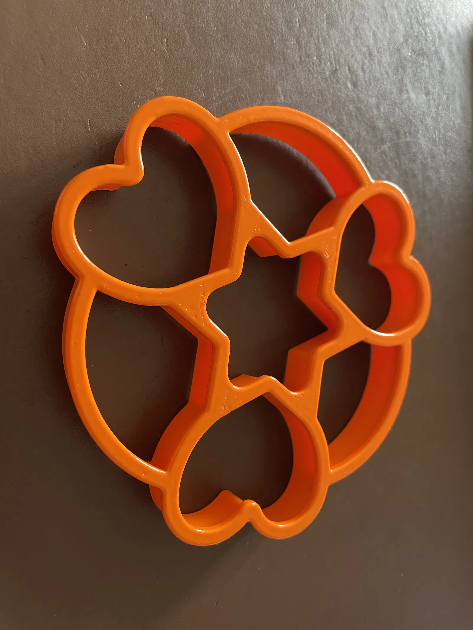 Khuôn cắt bánh quy kiểu oldschool, gồm 3 hình trái tim, 3 hình ngẫu nhiên và 1 ngôi sao, dựa trên một mẫu bị hư từ thập niên 70. Có gợi ý thông số in và vật liệu an toàn thực phẩm.
