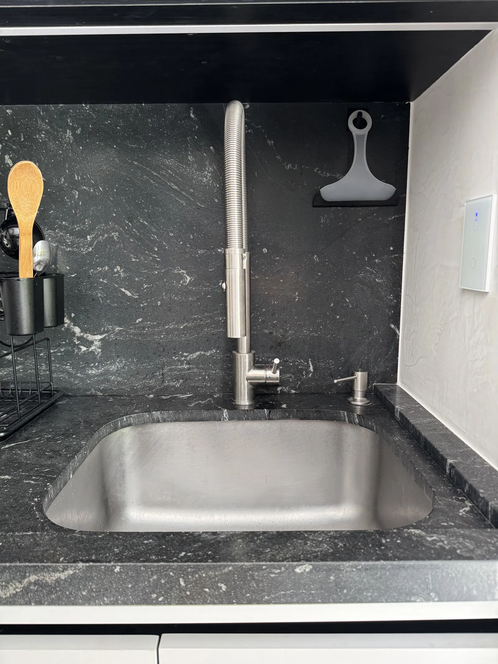 Mình tạo cái giá đỡ này để có thể cất miếng bọt biển ngay bên trong bồn rửa, nhìn bồn rửa bếp gọn gàng và sạch sẽ hơn.