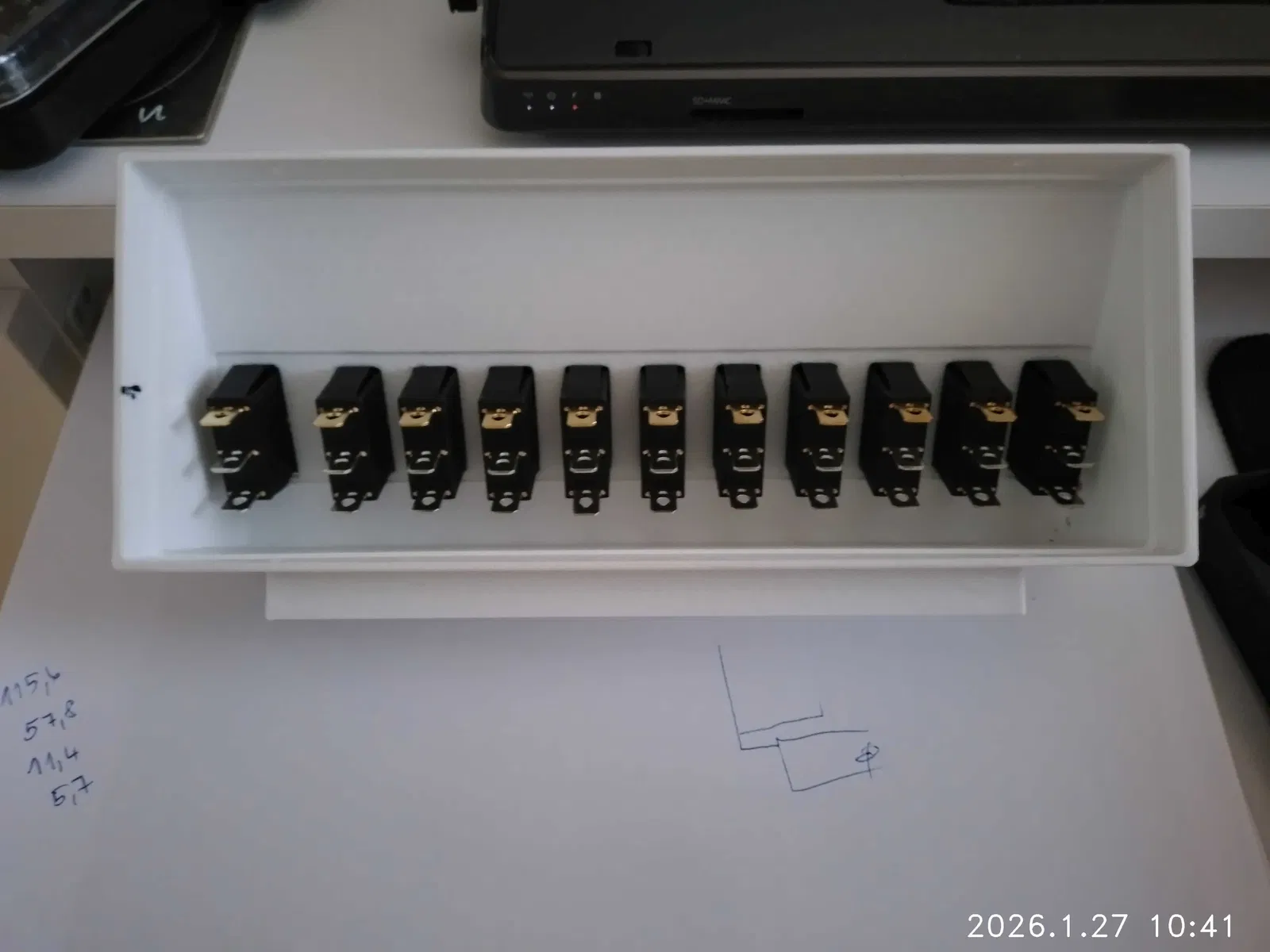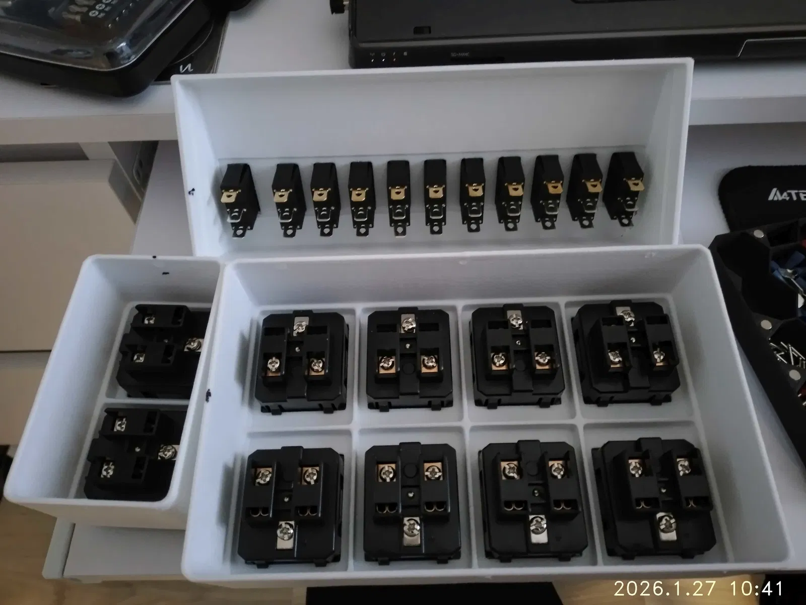 Bộ Krabička na zásuvky 230V: hộp cho ổ cắm 2x230V và 8x230V, kèm hộp cho công tắc rocker có đèn (11x). In PETG. Lỗ cable gland khoan sau khi ráp nắp-đáy; đấu faston 6,3mm và cos khoen d4,5mm.