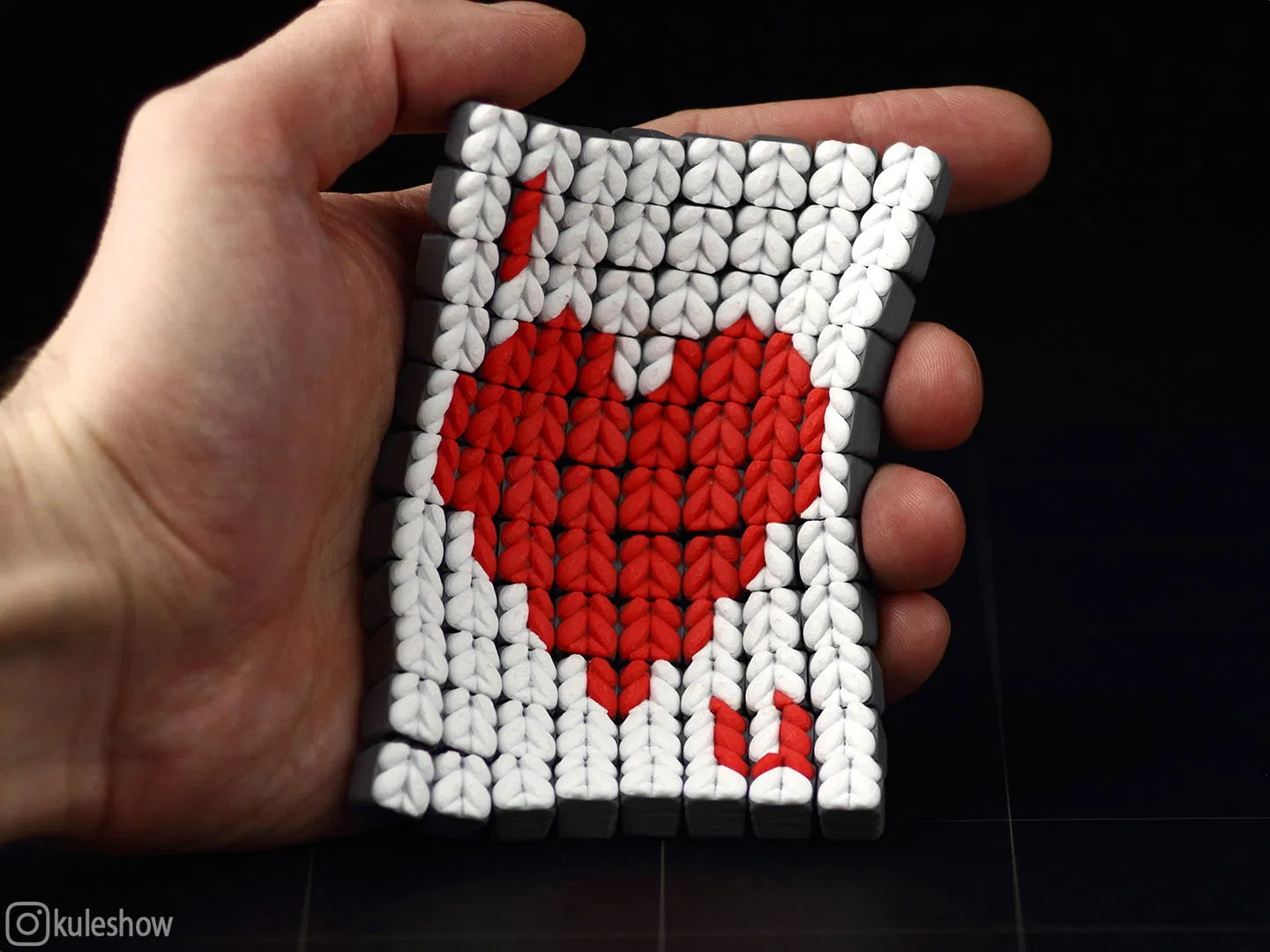 Mẫu Knitted Flexible Fabric Card 8x11 với thông điệp “I♥U”. Gợi ý thiết lập tô màu/Smart fill angle, dùng tối đa 2 màu và cần automatic filament change. Có thử in 100% (0.2 mm) và 75% (0.16 mm), kèm adaptive layer height cho hiệu ứng loop đẹp hơn.