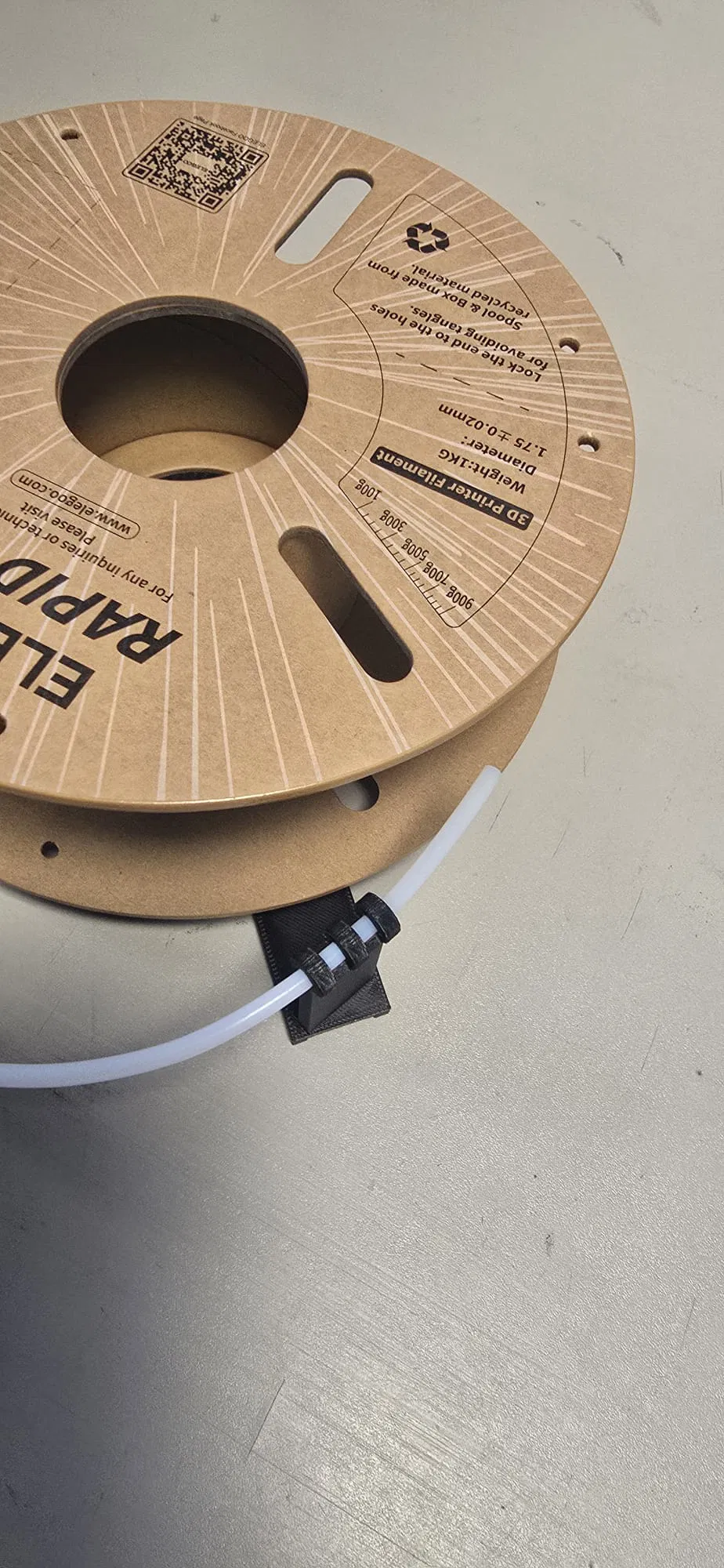 Phần chân dạng trượt (slide-on stand) có chỗ gắn một ống dẫn filament để filament được kéo ra gọn từ giữa cuộn. (chọn bản trái hoặc phải tùy góc của bạn)
