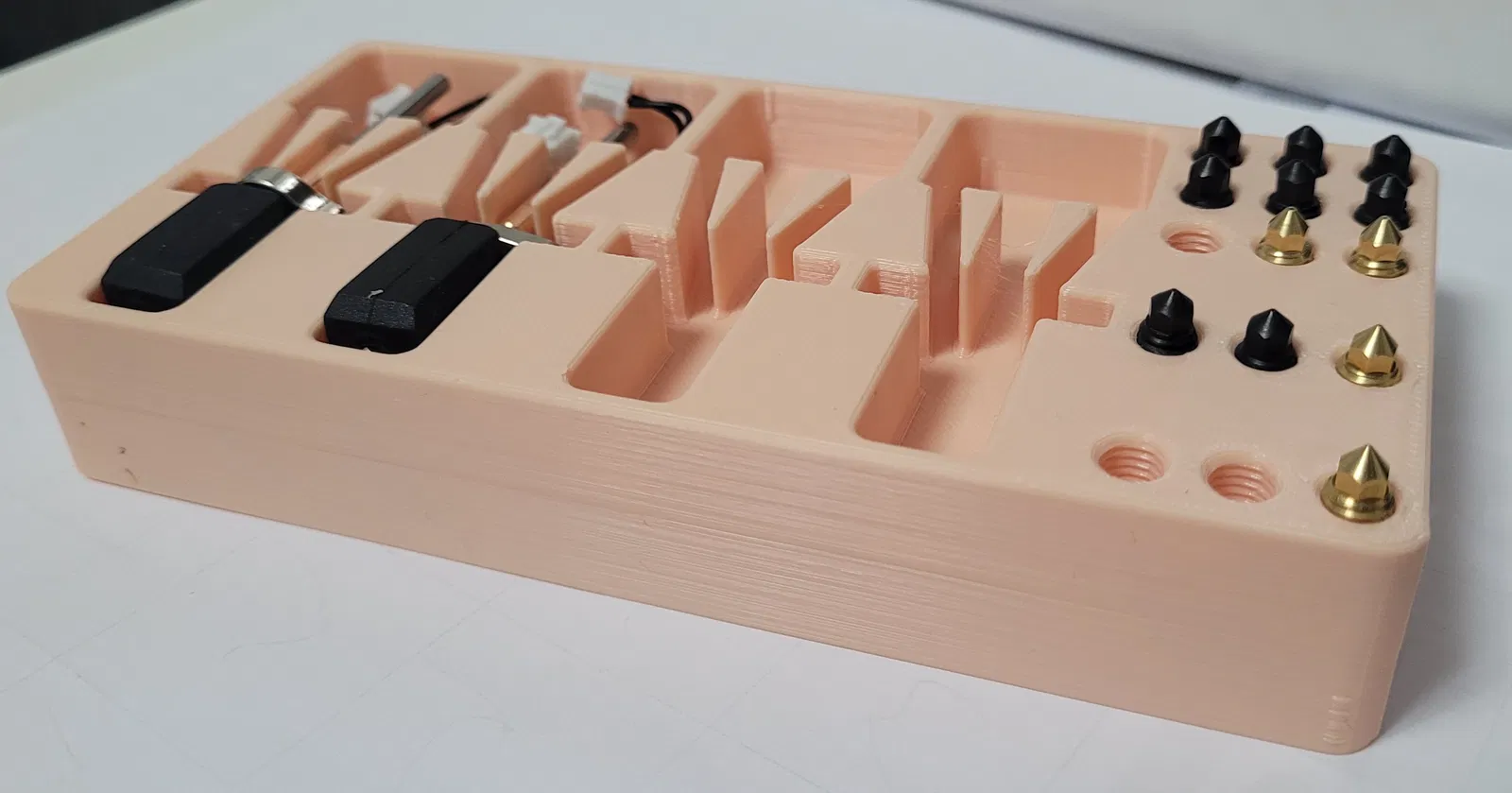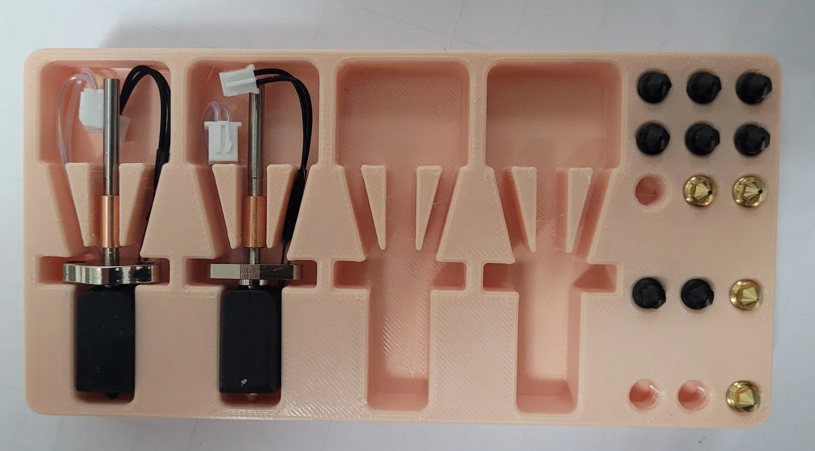 Inlay cho hộp lưu trữ Hotend upgrade và đầu nozzle dành cho Creality K1C/K1 Max. Hộp 160×106×40 mm chứa 4 hotend và 15 nozzle rời; lắp bằng 6 vít M3x40, có thể thêm foam và keo dán nhãn.