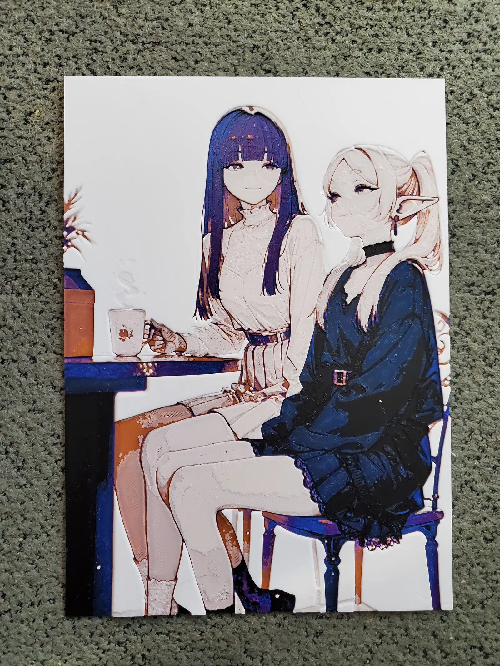 Mẫu Hueforge “Frieren & Fern Cafe” lấy cảm hứng từ Frieren: Beyond Journey's End. Hướng dẫn đổi màu theo layer rõ ràng (Black → Blue → Indigo Purple → Pink → Orange → Beige → Jade White) để in ra hiệu ứng màu chuẩn.