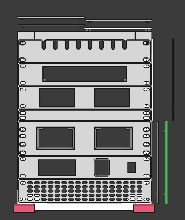 Thiết kế rack 10 inch có tấm hông và tấm trên, lấy cảm hứng từ @Mauker và được mình nâng cấp thêm tính năng. Lắp tấm hông bằng nam châm, tấm trên dạng pressure fit; dùng vít M5 và inserts để ráp khung.