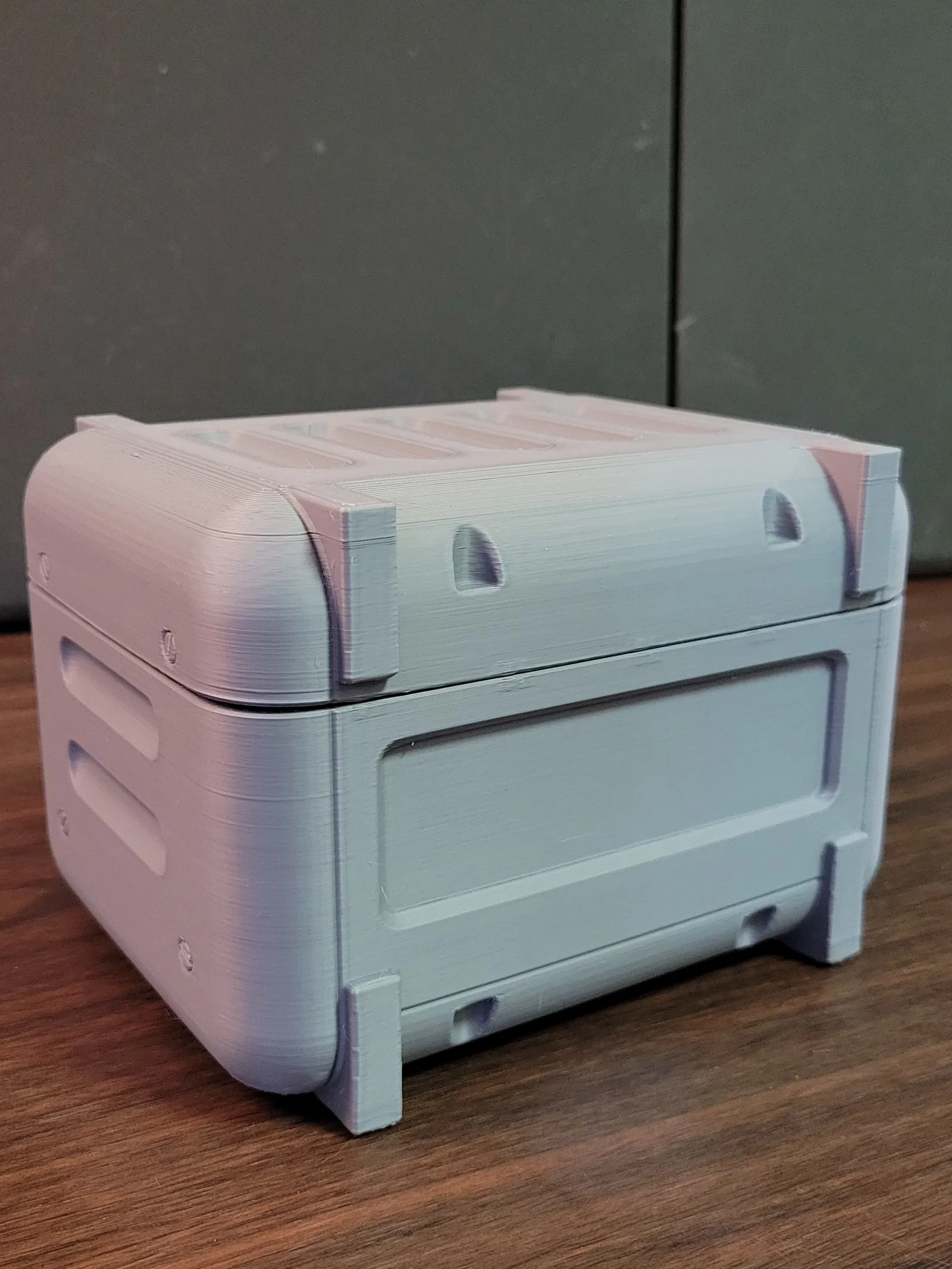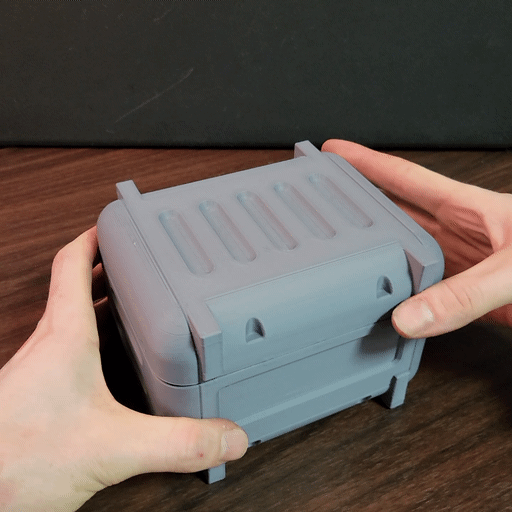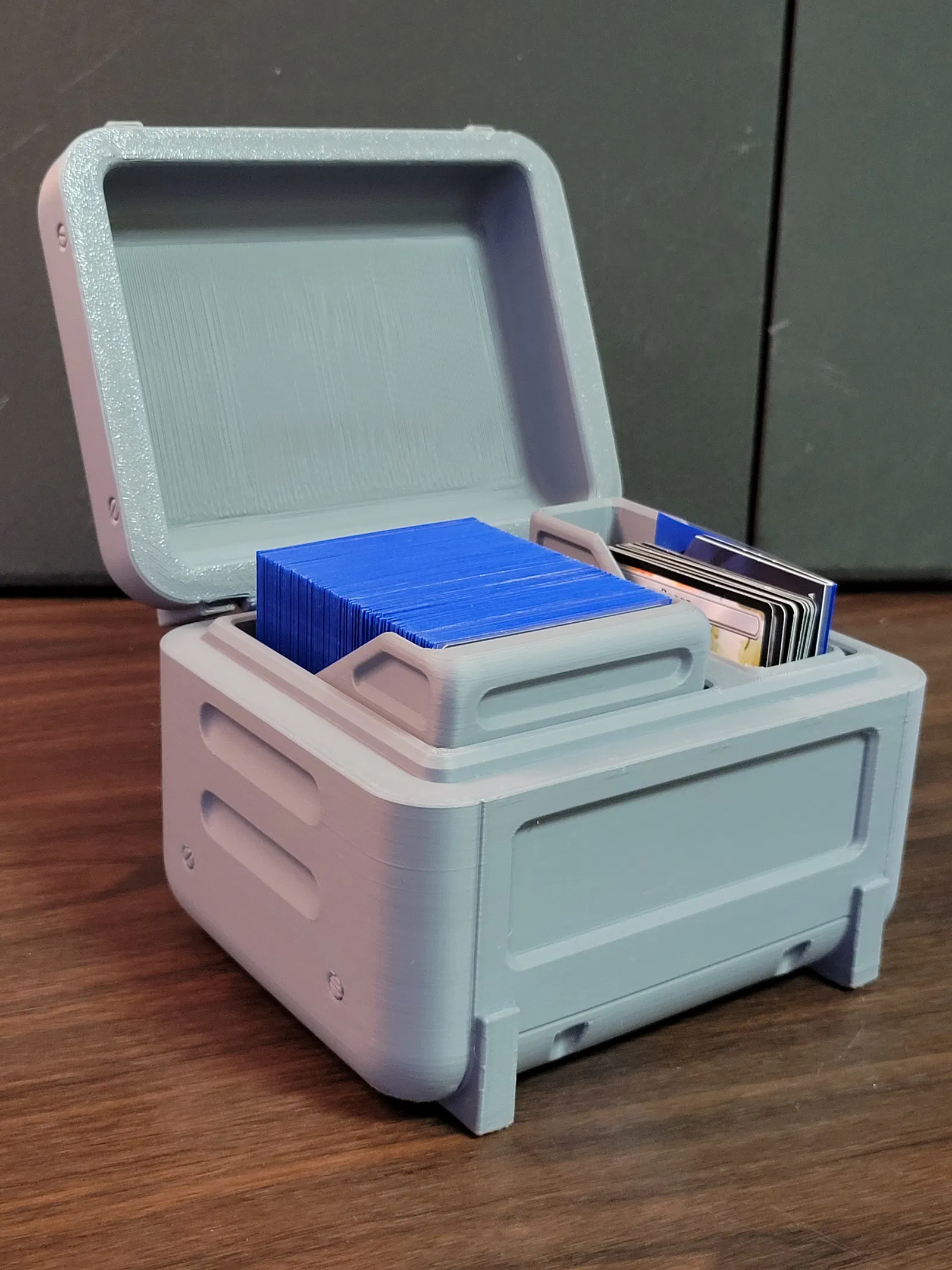Hộp đựng bài (Deck Box) phong cách Fallout cực ngầu dành cho bài thủ Magic: The Gathering. Thiết kế thông minh với khay bài và token tháo rời, nắp nam châm hít chắc chắn, chứa được hơn 100 thẻ double-sleeved. Tải về in ngay cho bộ bài Commander của bạn nhé!