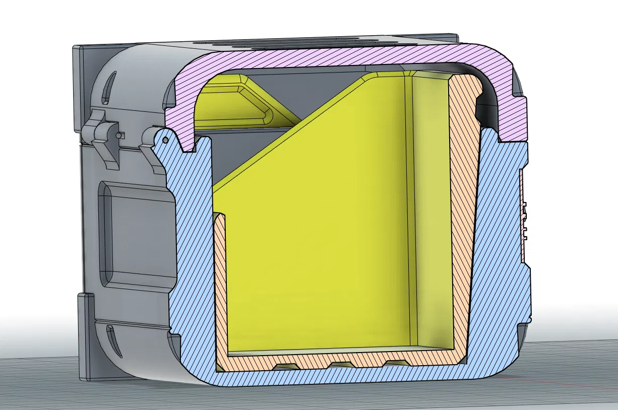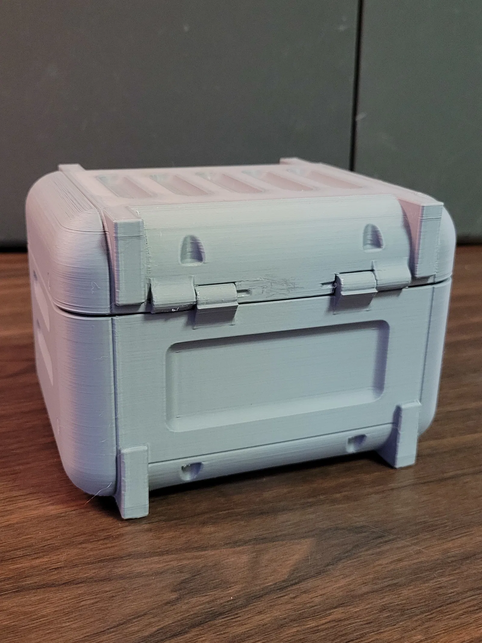 • Bản lề/Nắp: Cái bản lề cần chỉnh lại geometry bên ngoài xíu cho dễ in. Bản v174 bắt buộc phải in cái nắp kiểu "bay" trên support raft, làm cho mặt dưới nắp với lòng nắp hơi xấu, đổi lại được cái mặt tiền bên ngoài láng o.