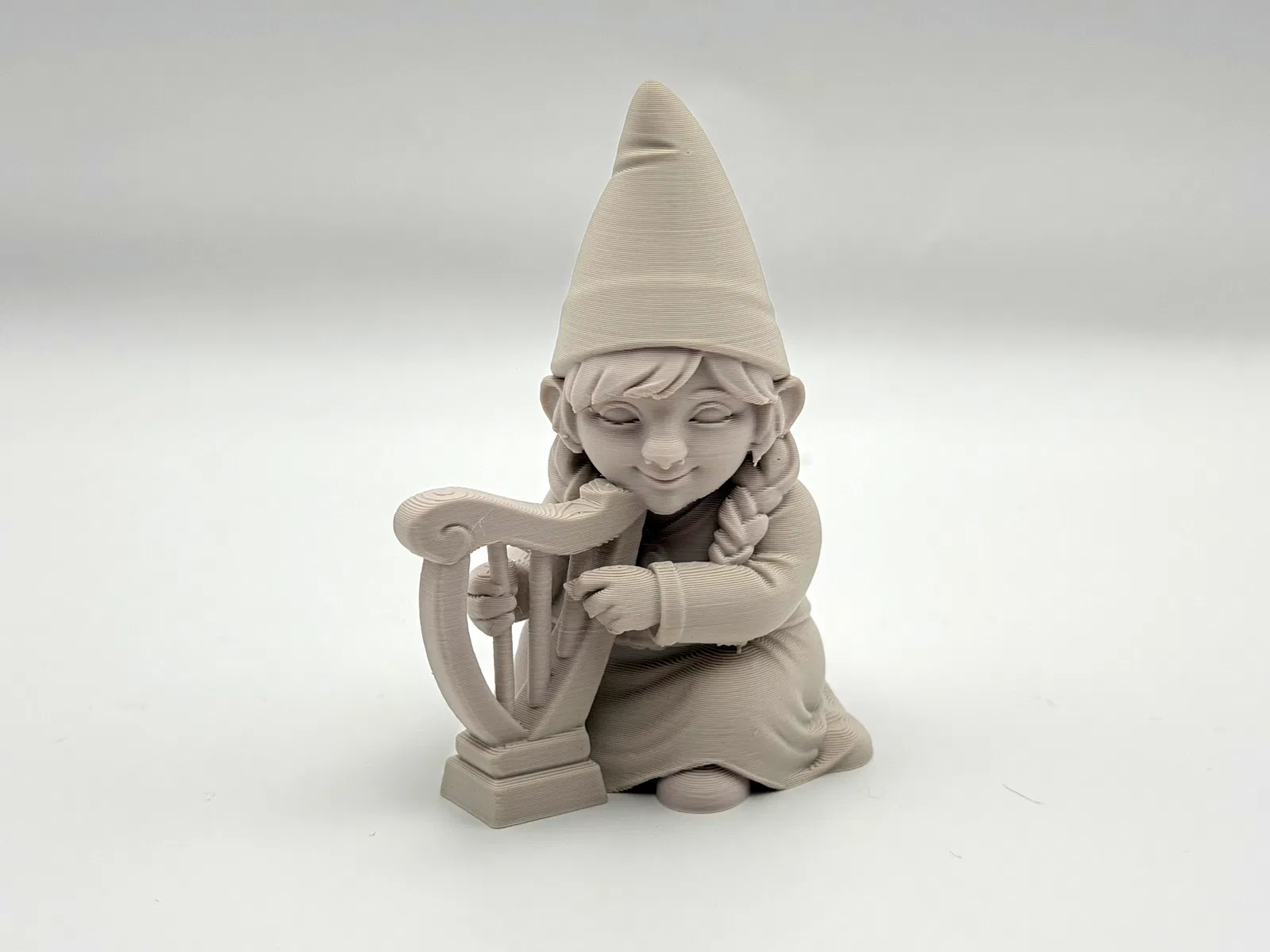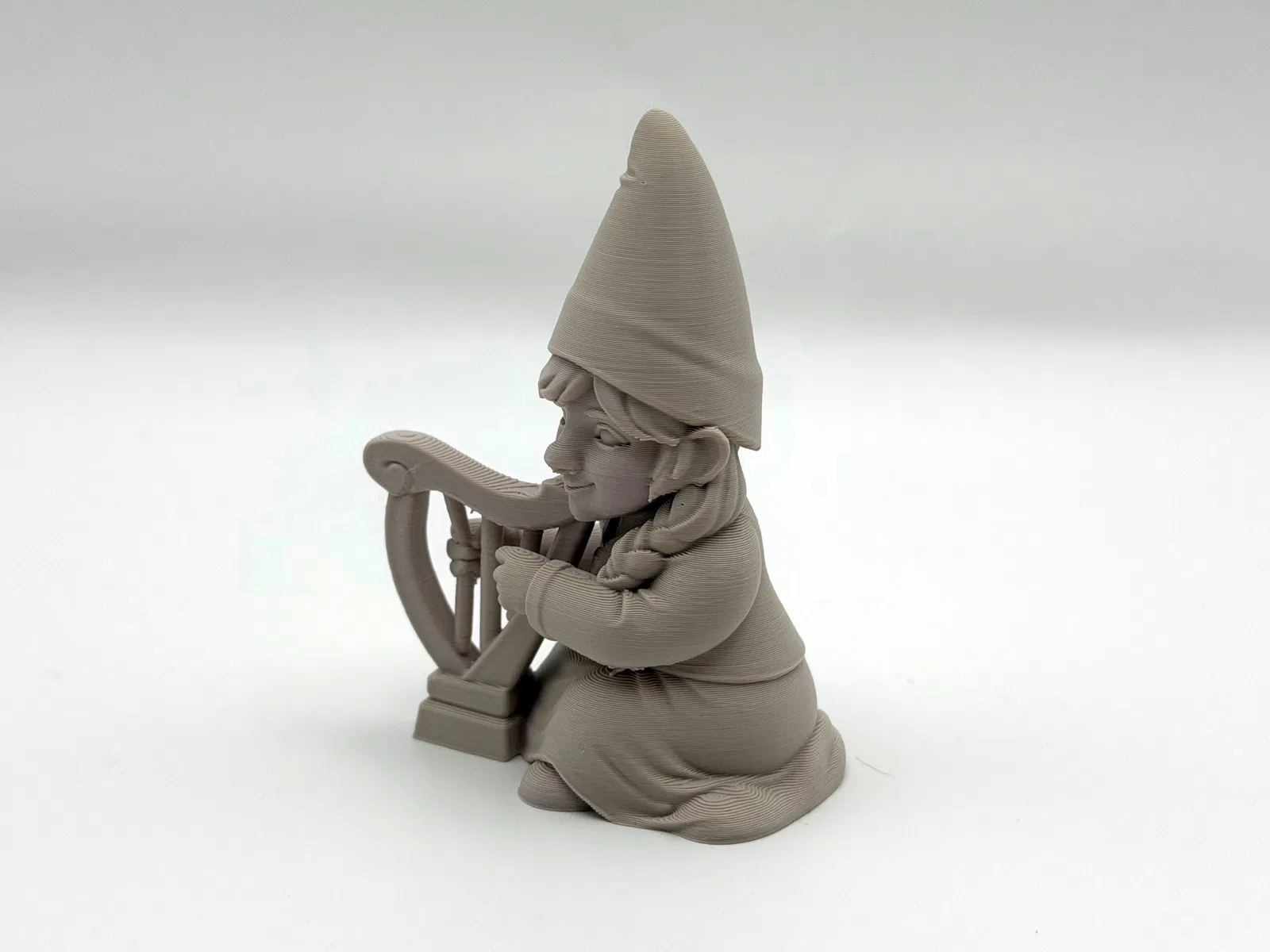 Harp Playing Gnome – cô gnome ngồi chơi đàn harp, mang vibe fantasy yên bình cho kệ trưng bày, bàn làm việc hay khu vườn. Mẫu cần supports; dùng organic supports và chỉnh Z-top height để tháo gỡ dễ hơn.