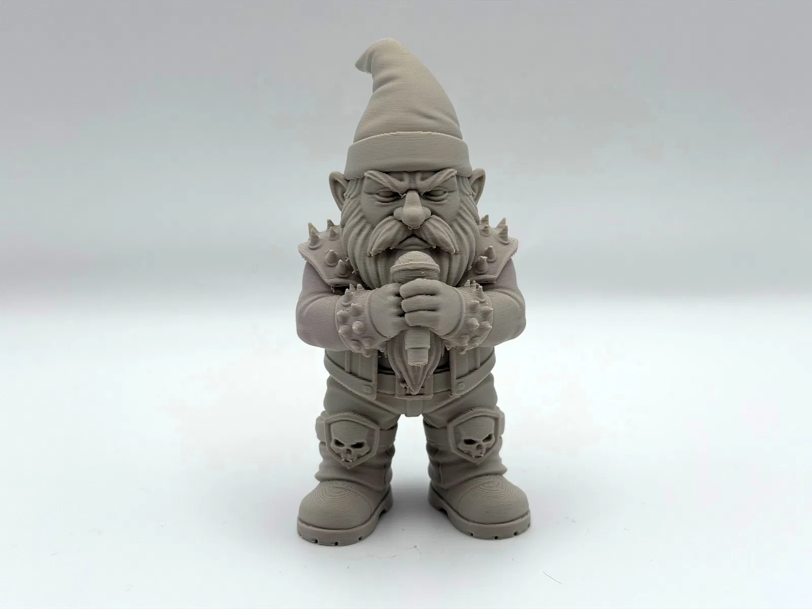 Skullsinger Gnome là chú gnome làm vườn phiên bản rock metal “dark” cực ngầu. Khi in cần supports; dùng organic-style supports và chỉnh Z-top height sẽ giúp tháo supports dễ, sạch và ít tốn công hơn.