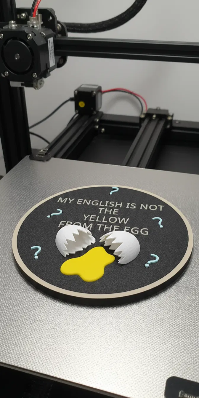 Tấm biển Denglisch “The Yellow from the Egg” giúp khách tới chơi cười liền. Có hiệu ứng 3D nổi khối, hỗ trợ in multicolor bằng Manual Layer Swap (không cần AMS/MMU), hợp treo văn phòng hay làm quà.