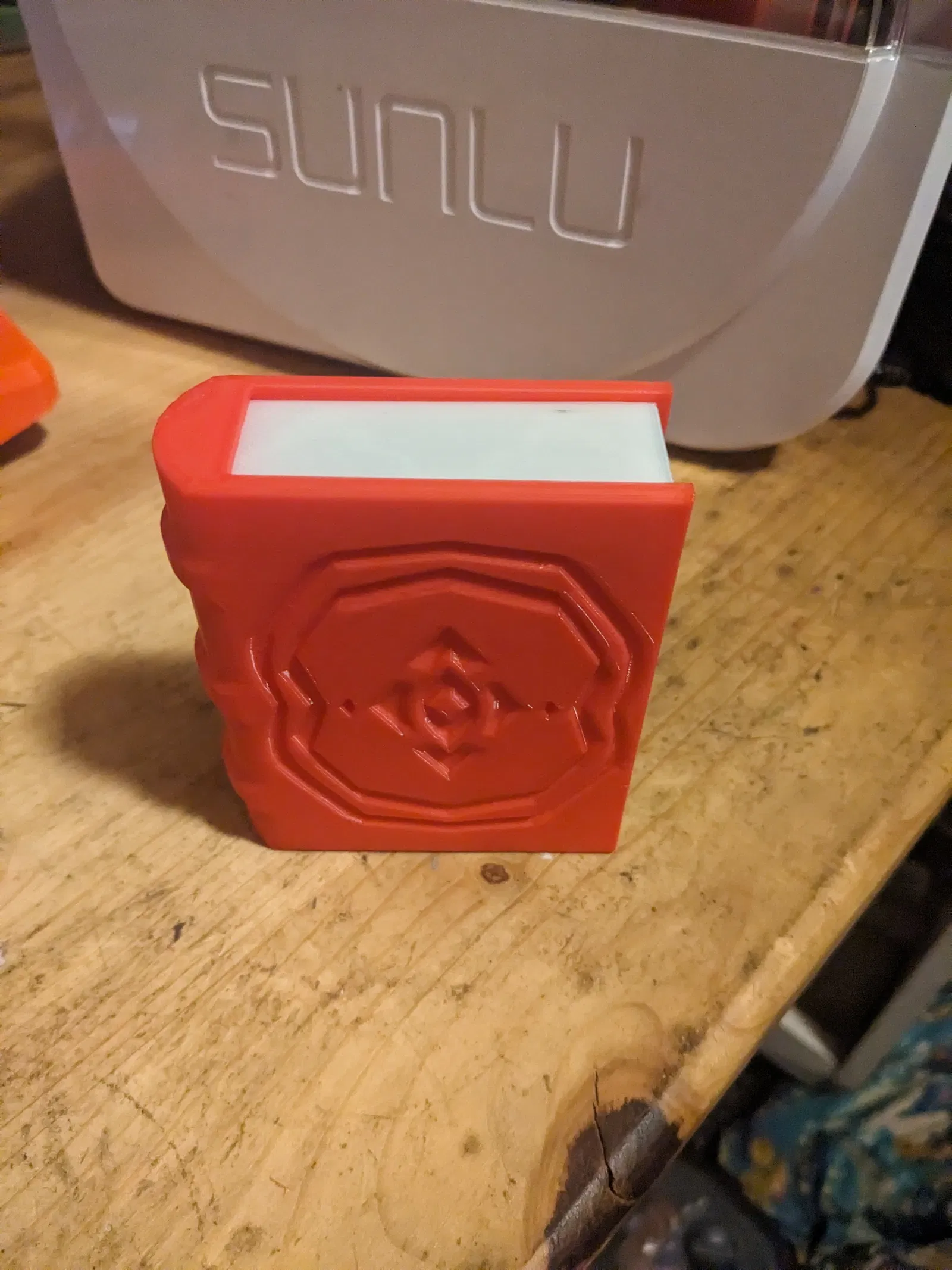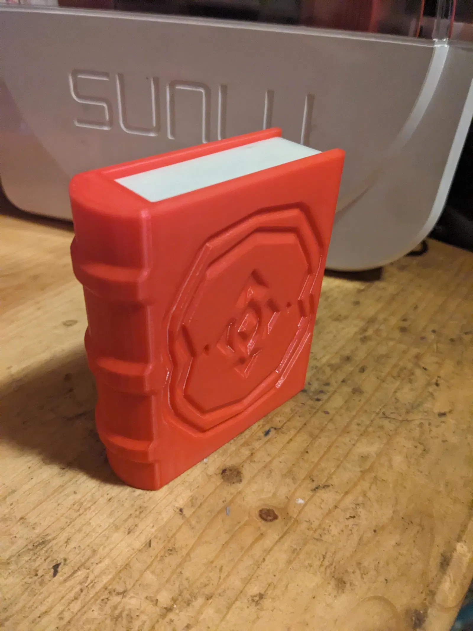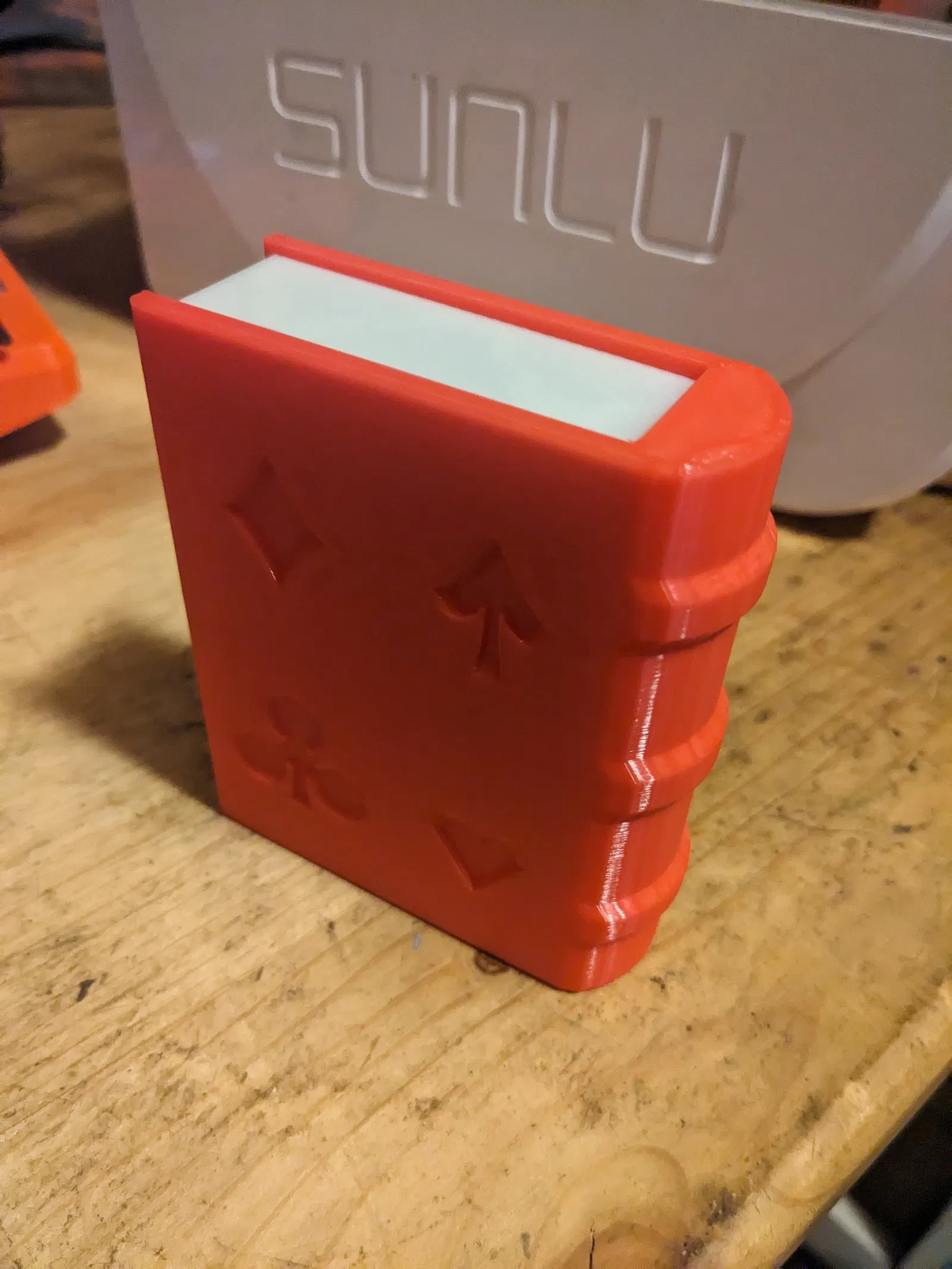 Hộp đựng bộ bài được thiết kế như một quyển sách. In phần Book kèm brim theo đúng orientation của file; supports không bắt buộc. Phần Pages không cần supports/brim; đặt bộ bài vào giữa rồi trượt vào khe.