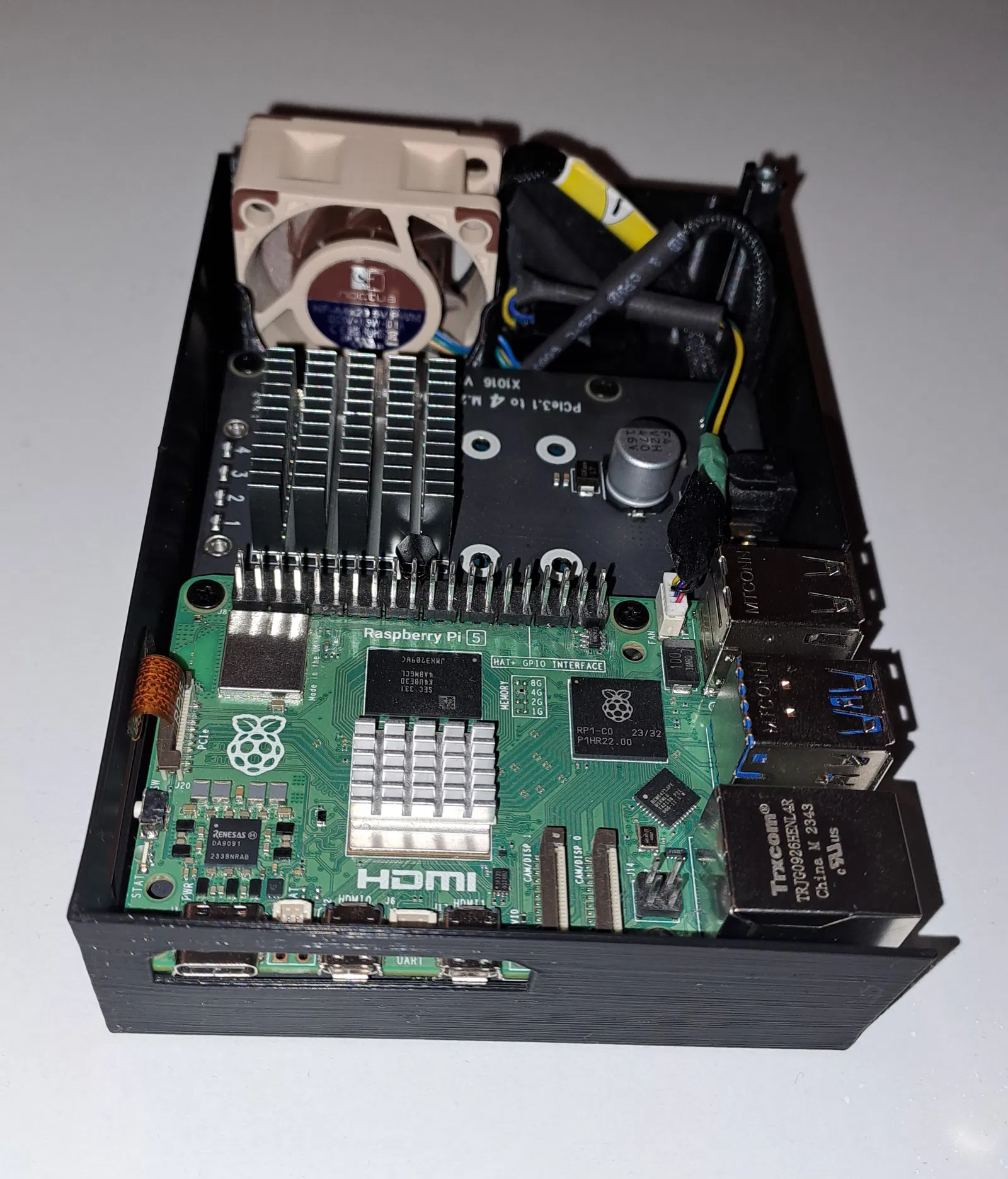 Vỏ cho Raspberry Pi 5 kết hợp Suptronics X1016 (PCIe 3.0) để gắn tối đa 4 NVME SSD, làm mát bằng quạt Noctua NF-A4x20 5V PWM. Có hướng dẫn lắp nắp friction fit và danh sách ốc 2.5mm.