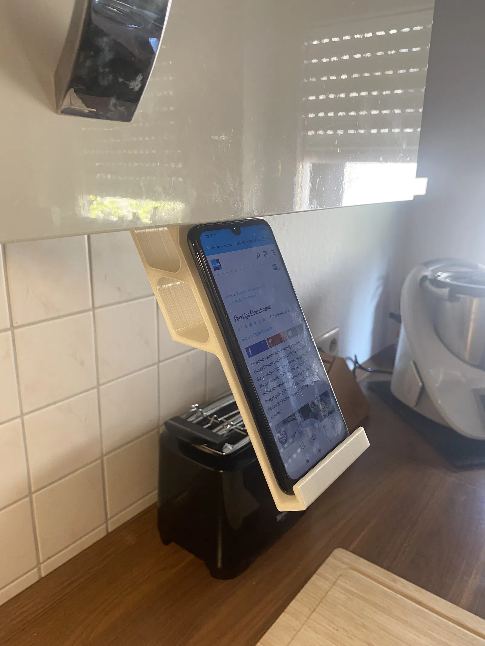 Giá đỡ điện thoại gắn vào tủ bếp treo giúp rảnh tay khi nấu ăn, đặt máy ở độ cao dễ nhìn/đọc. In bằng PLA, không cần support; ngàm kẹp rộng 18mm, vừa iPhone 11 và Xiaomi Red Mi Note 7.