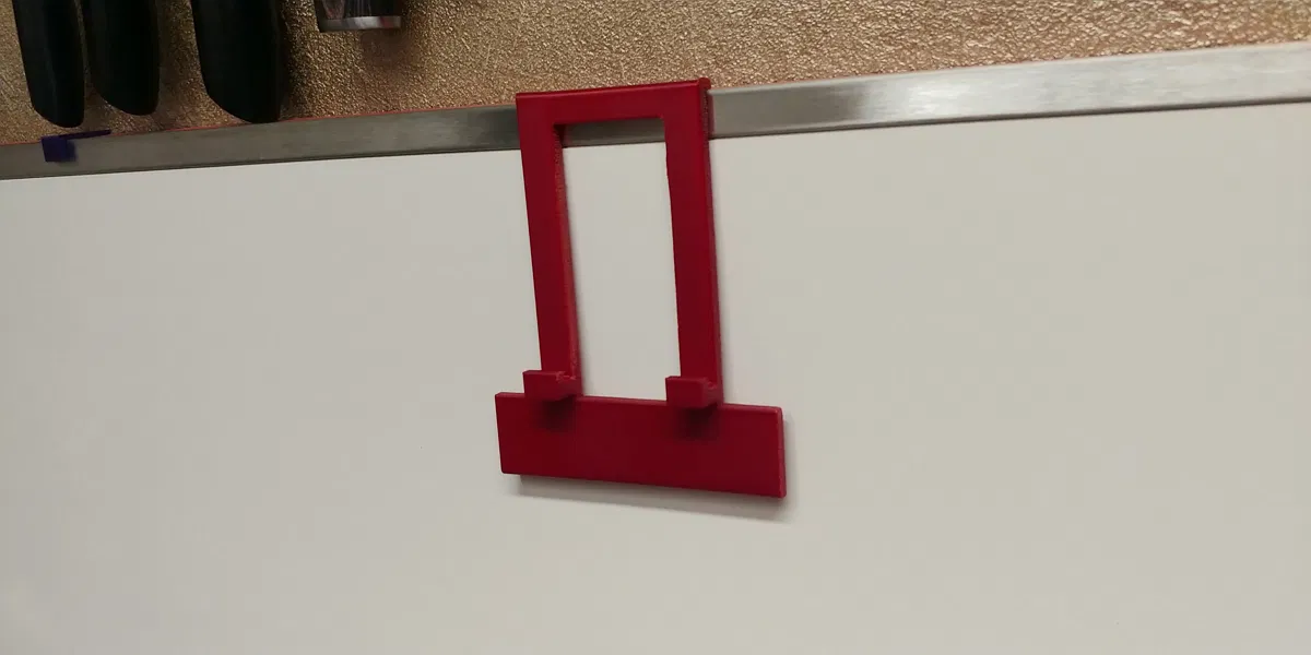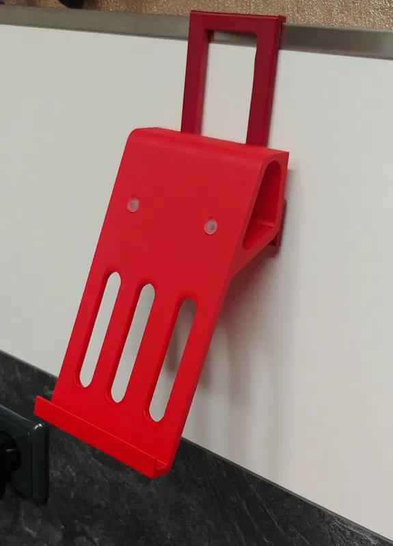 Giá đỡ smartphone/tablet lấy ý tưởng từ Gigi1893, dùng treo trên thanh nẹp hoàn thiện trong bếp (inox góc + thanh gỗ). Móc treo có thể trượt dọc thanh; có lỗ gắn nút silicon chống trượt. In PLA.